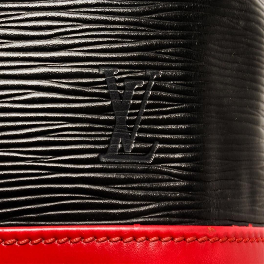 One Louis Vuitton Black And Red Epi Leather Noe Shoulder Bag. Item is sold AS-IS. All available information is listed in the description and shown in the photo. Louis Vuitton black and red epi leather Noe shoulder bag with this vintage 1991 features a bicolor epi leather body, an adjustable shoulder strap, and a top red leather drawstring closure and interior zipper pocket. such a great color combination bag from the 90s. The leather strap is peeling, the leather is cracking on the strap and hardware is tarnished as shown in pictures. Height: 10.23" Width: 13.38" Depth: 7.08" , Shoulder Drop: 20.07" / 26 x 34 x 18 Cm