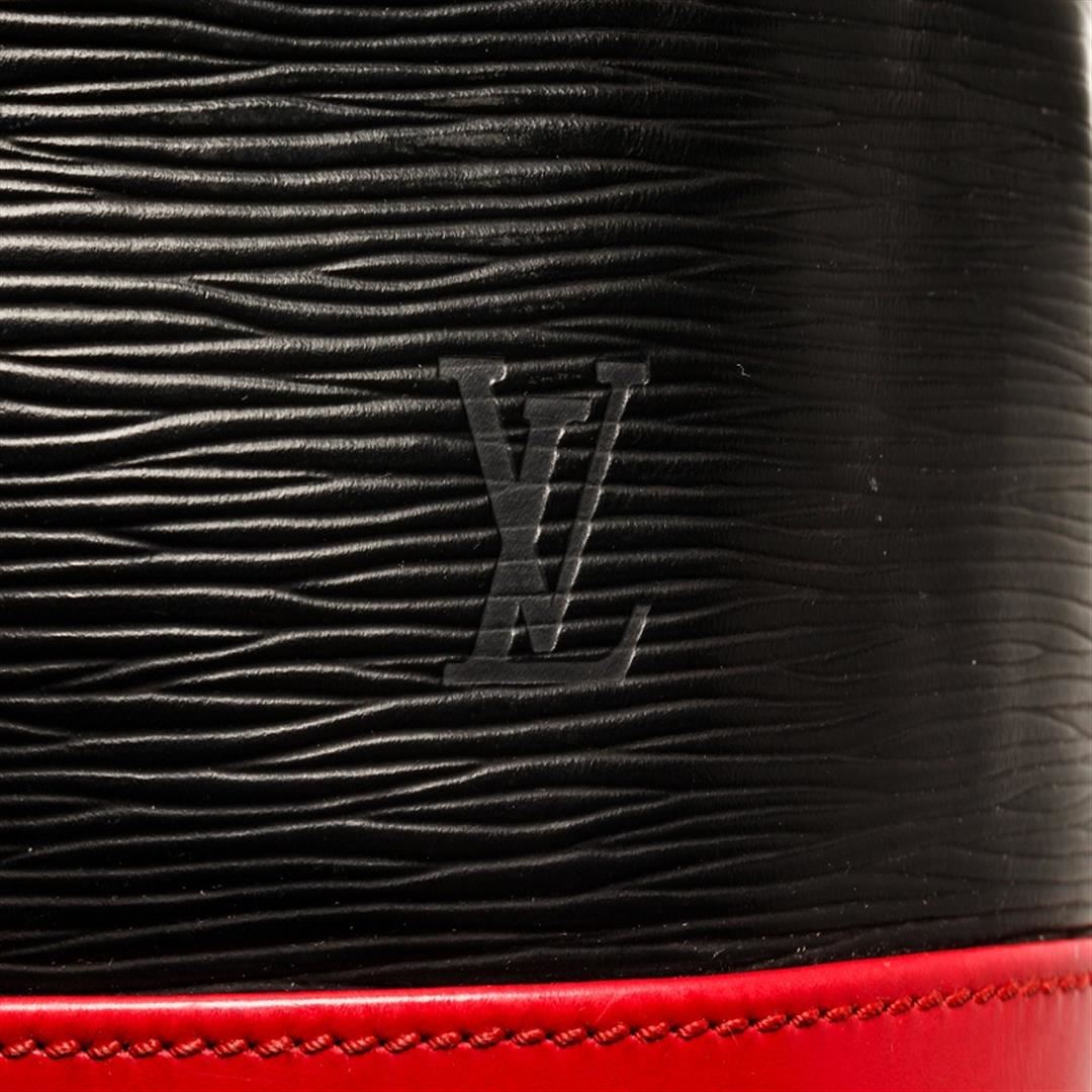 One Louis Vuitton Black And Red Epi Leather Noe Shoulder Bag. Item is sold AS-IS. All available information is listed in the description and shown in the photo. Louis Vuitton black and red epi leather Noe shoulder bag with this vintage 1991 features a bicolor epi leather body, an adjustable shoulder strap, and a top red leather drawstring closure and interior zipper pocket. Such a great color combination bag from the 90s. Leather is peeling on strap where date code is and the hardware is tarnished. Please refer to photos. Height: 10.23" Width: 13.38" Depth: 7.08", Shoulder Drop: 20.07" / 26 x 34 x 18 Cm