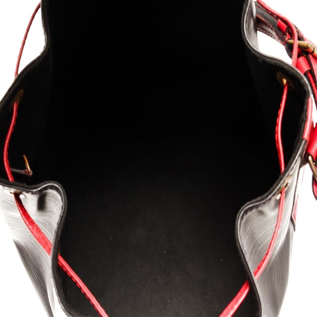 One Louis Vuitton Black And Red Epi Leather Noe Shoulder Bag. Item is sold AS-IS. All available information is listed in the description and shown in the photo. Louis Vuitton black and red epi leather Noe shoulder bag with this vintage 1991 features a bicolor epi leather body, an adjustable shoulder strap, and a top red leather drawstring closure and interior zipper pocket. Such a great color combination bag from the 90s. Leather is peeling on strap where date code is and the hardware is tarnished. Please refer to photos. Height: 10.23" Width: 13.38" Depth: 7.08", Shoulder Drop: 20.07" / 26 x 34 x 18 Cm