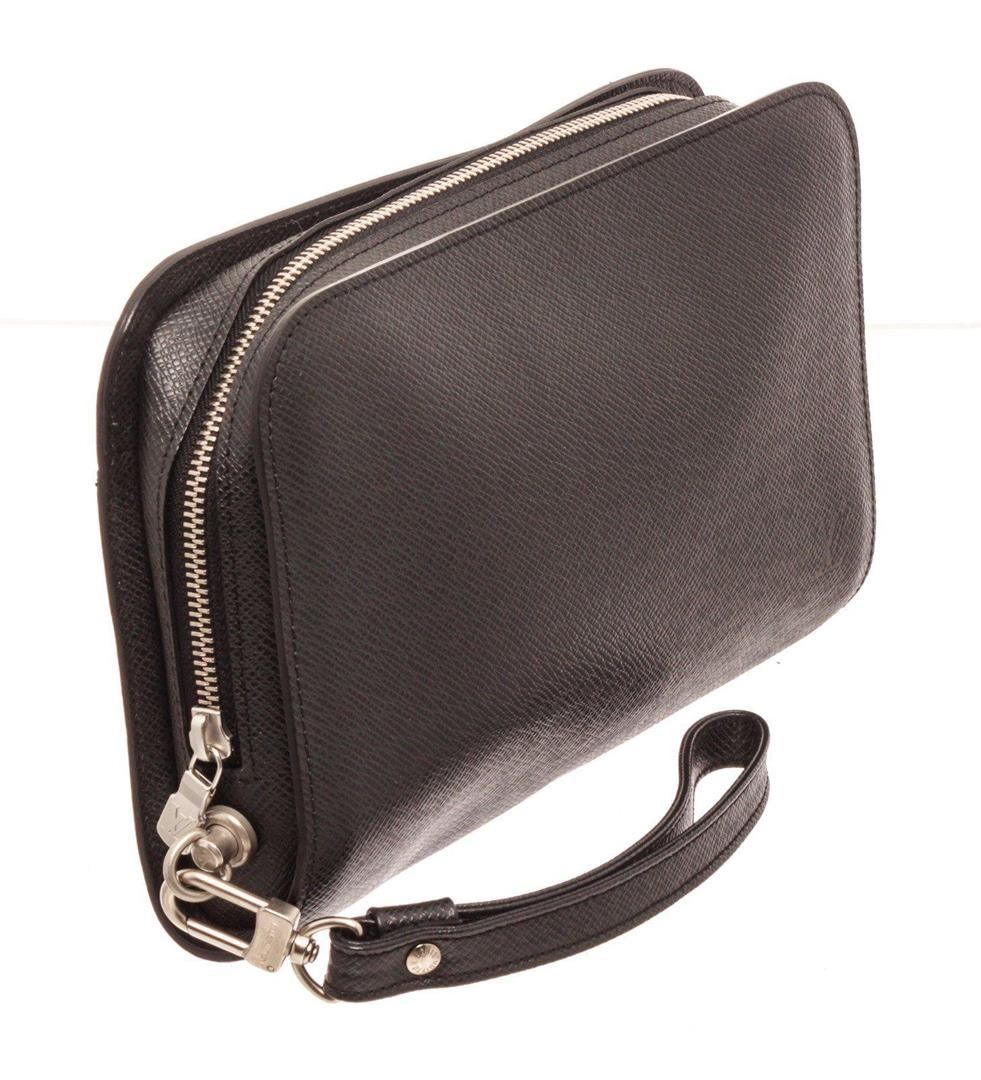 Louis Vuitton Black Baikal Pochette Clutches with gold-tone hardware, trim tan vachetta leather, leather lining, three interior compartments pockets and zipper closure. MEASUREMENTS: Length 7 in / 18 cm Width 9.25 in / 23 cm Height 2 in / 5 cmCONDITION: Pre-Owned Good overall, please see photographs for detail.