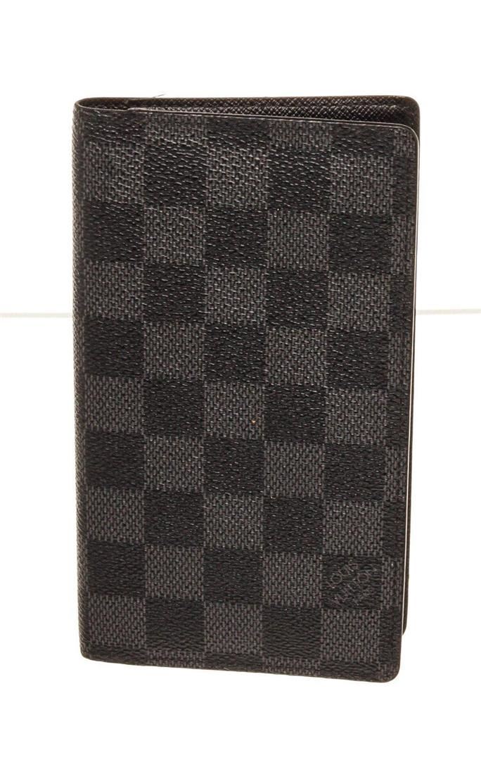 Louis Vuitton Black Damier Canvas Passport Cover Wallet with damier canvas gold-tone hardware, trim tan vachetta leather, interior slip pocket and flap closure.