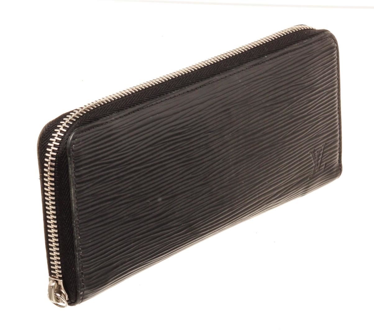One Louis Vuitton Black Epi Leather Clemence Wallet. Item is sold AS-IS. All available information is listed in the description and shown in the photo. Louis Vuitton Black Epi Leather Clemence Wallet with epi leather, gold-tone hardware, trim tan vachetta leather, interior three compartments pocket and zipper closure.