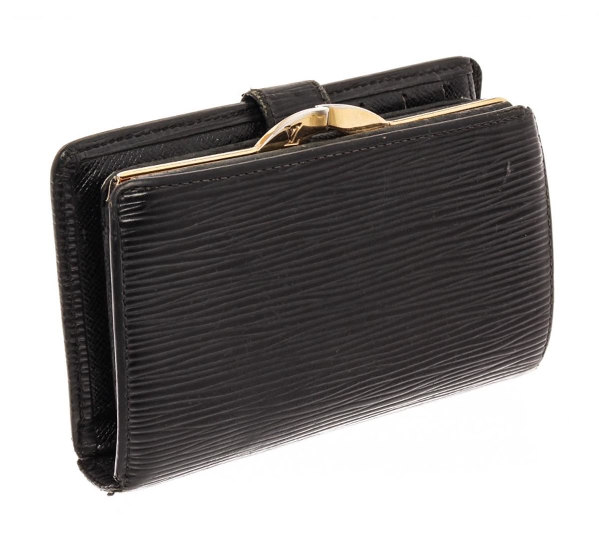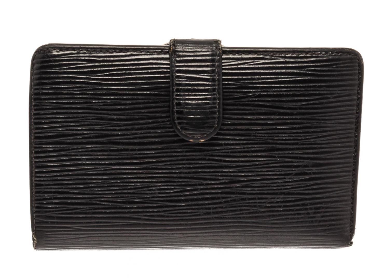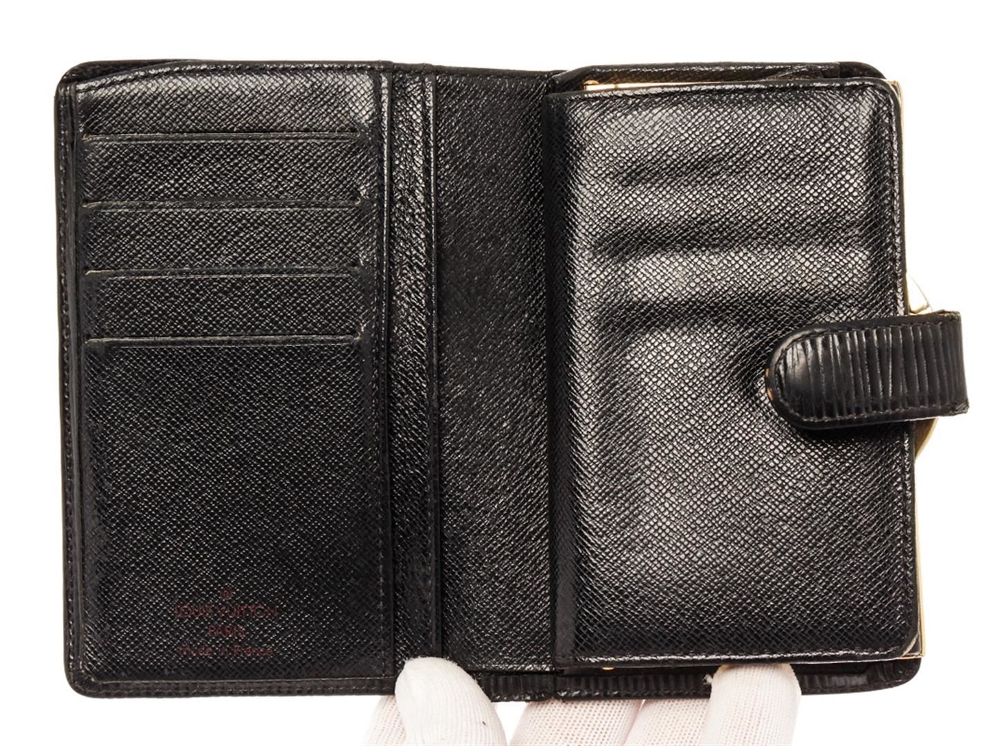 Louis Vuitton Black Epi Leather French Wallet. All available information is listed in the description and shown in the photos. louis vuitton black epi leather french wallet with epi leather, gold-tone hardware, trim tan vachetta leather, three interior compartments pockets, leather lining and snap closure.