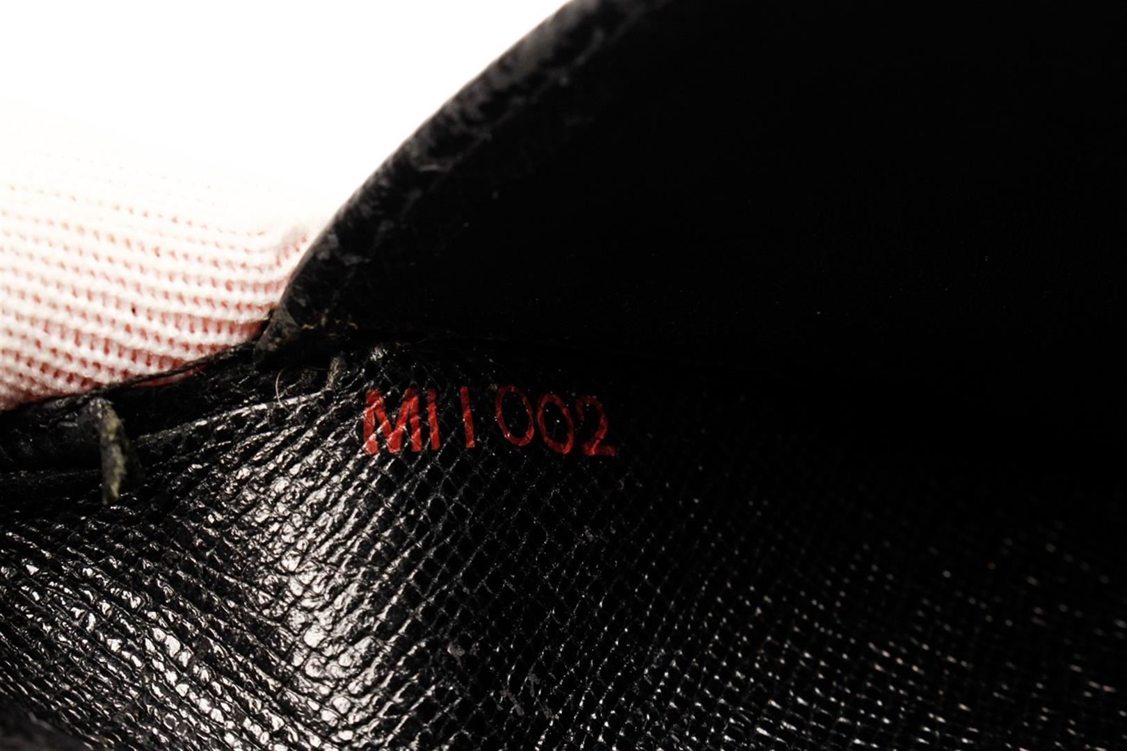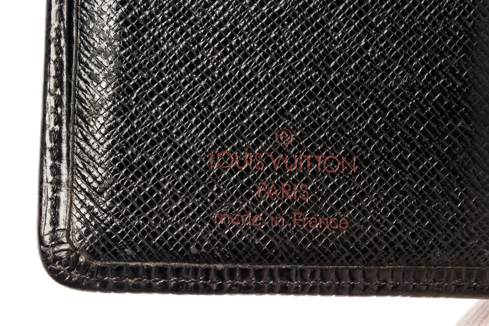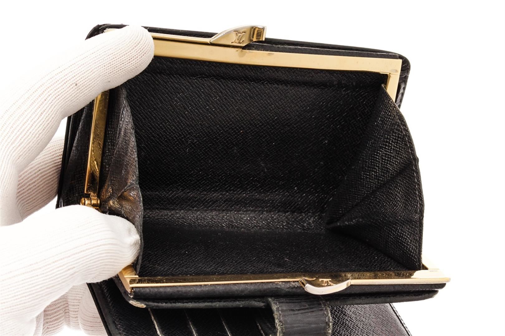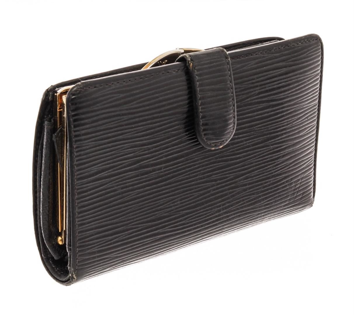 Louis Vuitton Black Epi Leather French Wallet. All available information is listed in the description and shown in the photos. louis vuitton black epi leather french wallet with epi leather, gold-tone hardware, trim tan vachetta leather, three interior compartments pockets, leather lining and snap closure.