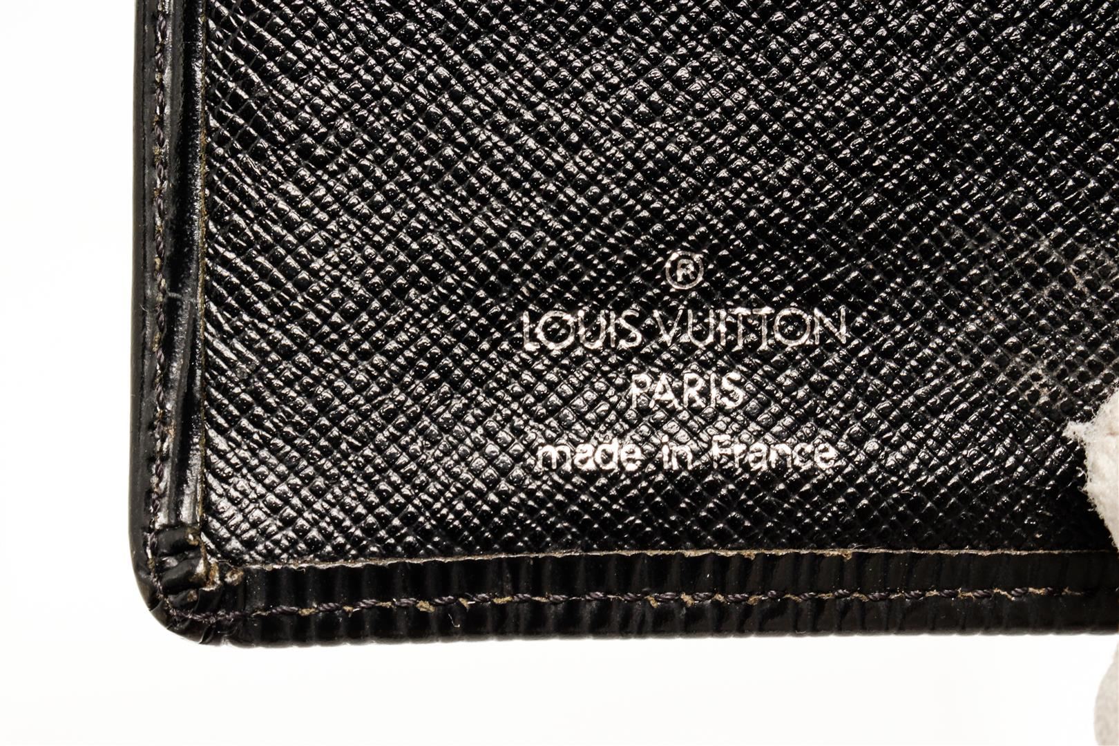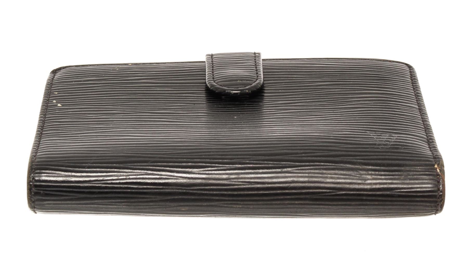 One Louis Vuitton Black Epi Leather French Wallet. Item is sold AS-IS. All available information is listed in the description and shown in the photo. Louis Vuitton Black Epi Leather French Wallet with gold-tone hardware, single coin compartment with Kiss-lock closure, black leather lining, dual slit compartments, four card slots, and snap closure at front. Please note hardware for closure is damaged.
