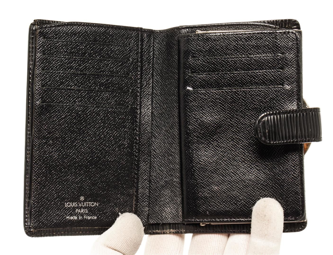 One Louis Vuitton Black Epi Leather French Wallet. Item is sold AS-IS. All available information is listed in the description and shown in the photo. Louis Vuitton Black Epi Leather French Wallet with gold-tone hardware, single coin compartment with Kiss-lock closure, black leather lining, dual slit compartments, four card slots, and snap closure at front. Please note hardware for closure is damaged.