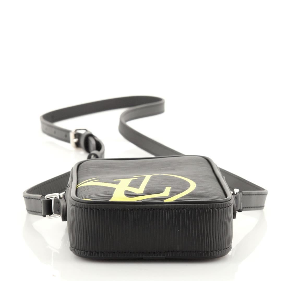 Louis Vuitton Danube PM Crossbody Bag features black Epi leather PM signed with acid-green LV Initials at the front, silver-tone hardware, cowhide leather trim interior slip pockets, black textile lining, adjustable leather shoulder strap, and zip closure at top.