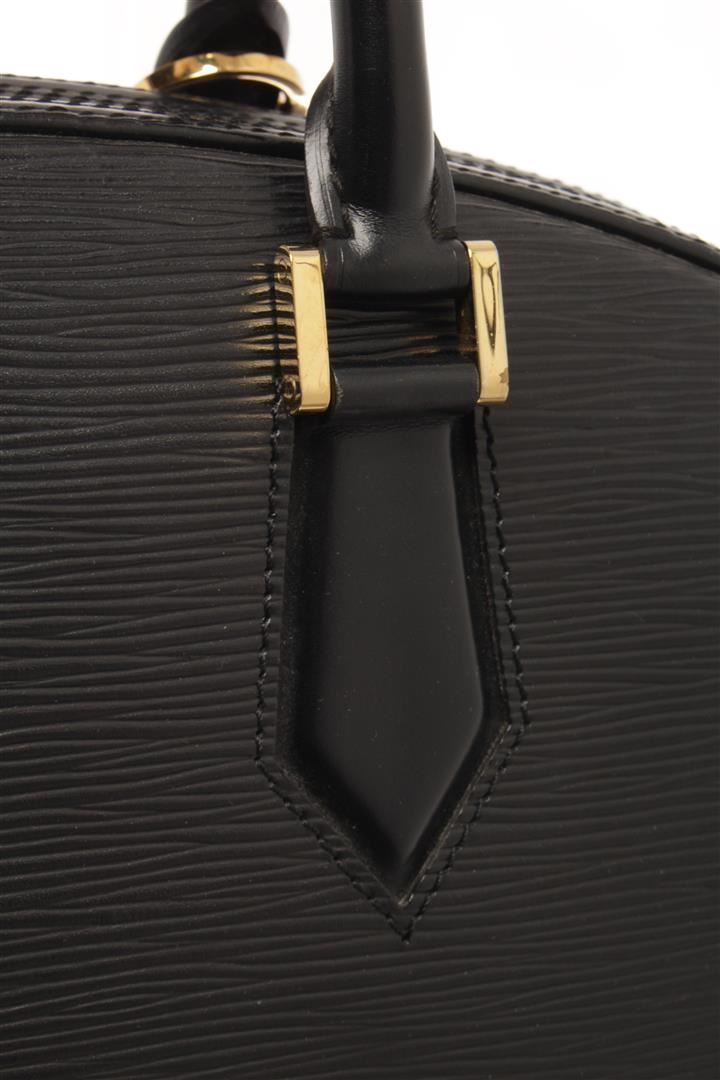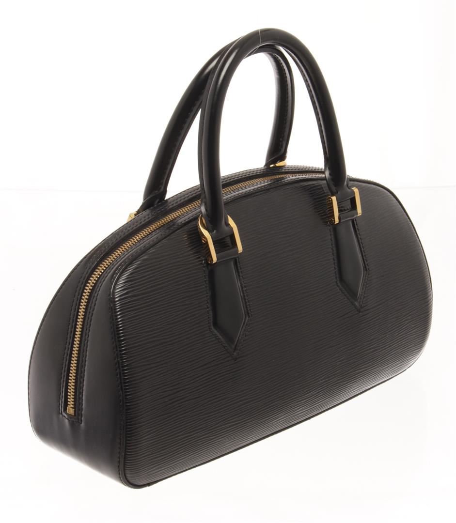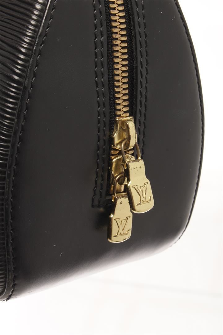 One Louis Vuitton Black Epi Leather Jasmin Satchel Bag. Item is sold AS-IS. All available information is listed in the description and shown in the photo. Louis Vuitton Black Epi Leather Jasmin Satchel Bag with top handle, gold tone hardware, suede lining, interior pocket slip, zipper closure. Depth 3.9 in, Handle 3.5 in, Height 7.1 in, Width 12.6 in/ Depth 10 cm, Handle 9 cm, Height 18 cm, Width 32 cm