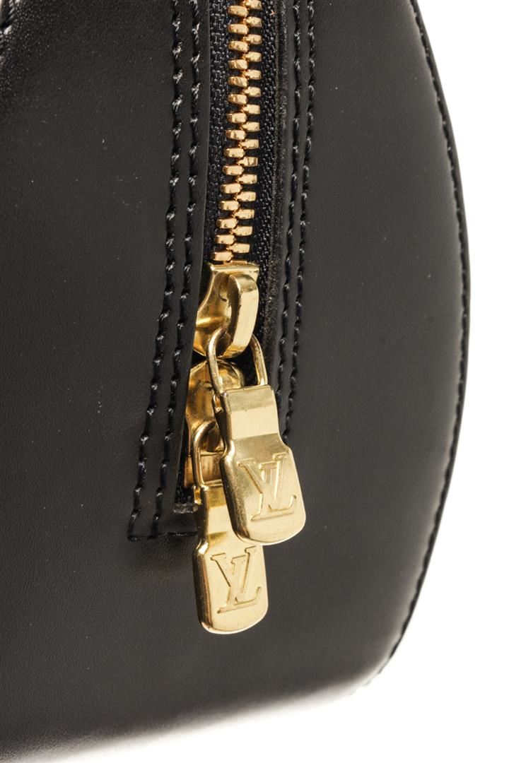 One Louis Vuitton Black Epi Leather Jasmine Bag. Item is sold AS-IS. All available information is listed in the description and shown in the photo. louis vuitton black epi leather jasmine bag with silver-tone hardware rolled handles microfiber lining & single interior pocket zip closure at top includes dust bag. Height: 3.75" Width: 12.5" Depth: 3.75" , Handle Drop: 3.75" / 9.52 x 31.75 x 9.52 Cm