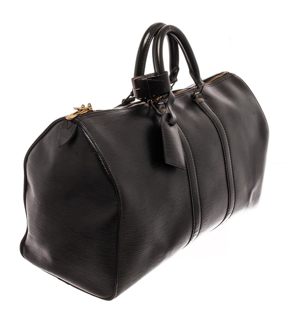 Louis Vuitton Black Epi Leather Keepall 45 Travel Bag. All available information is listed in the description and shown in the photos. Louis Vuitton Black Epi Leather Keepall 45 Travel Bag with black epi leather, brass hardware, dual rolled leather top handles, single exterior pocket, alcantara lining, zip closure at top. Height: 10.75" Width: 19.5" Depth: 8.25", Handle Drop: 4.5" / 27.30 x 49.53 x 20.95 cm
