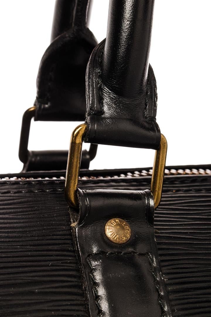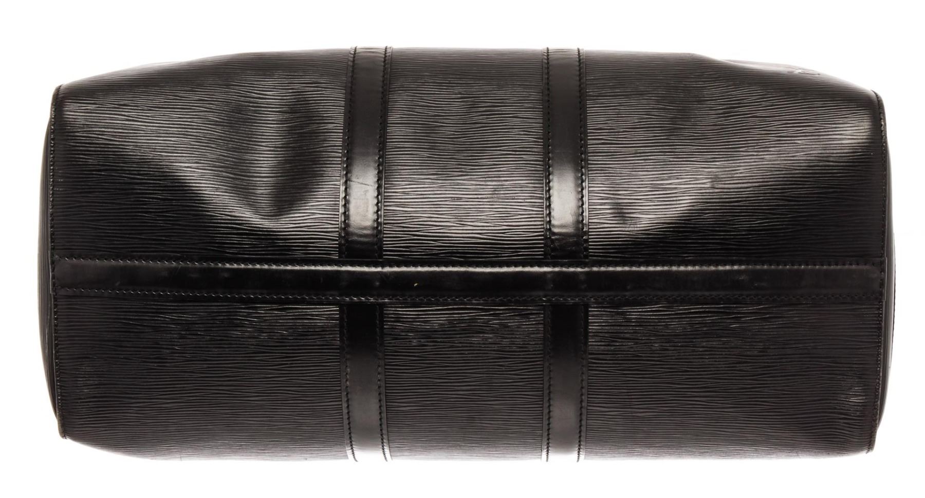 Louis Vuitton Black Epi Leather Keepall 45 Travel Bag. All available information is listed in the description and shown in the photos. Louis Vuitton Black Epi Leather Keepall 45 Travel Bag with black epi leather, brass hardware, dual rolled leather top handles, single exterior pocket, alcantara lining, zip closure at top. Height: 10.75" Width: 19.5" Depth: 8.25", Handle Drop: 4.5" / 27.30 x 49.53 x 20.95 cm