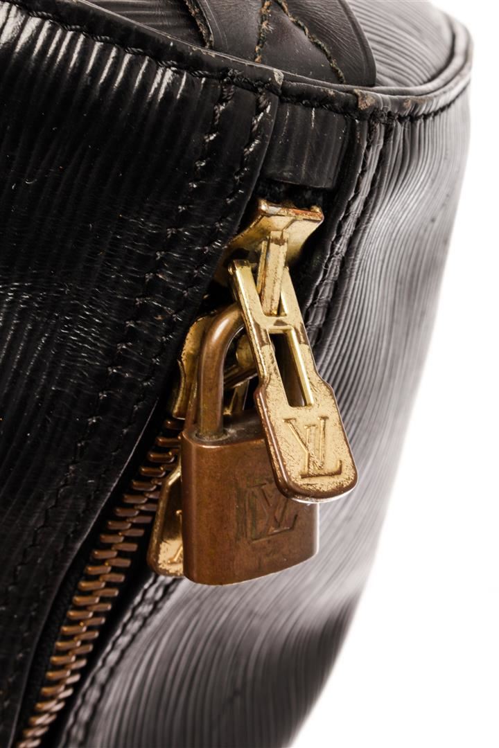 Louis Vuitton Black Epi Leather Keepall 50 Weekend/Travel Bag. All available information is listed in the description and shown in the photos. Louis Vuitton Black Epi Leather Keepall 50 Weekend/Travel Bag with black epi leather, brass hardware, rolled handles, single exterior pocket, unlined, zip closure at top. Height: 11", Width: 20", Depth: 8.5" / 27.94 x 50.8 x 21.59 CM