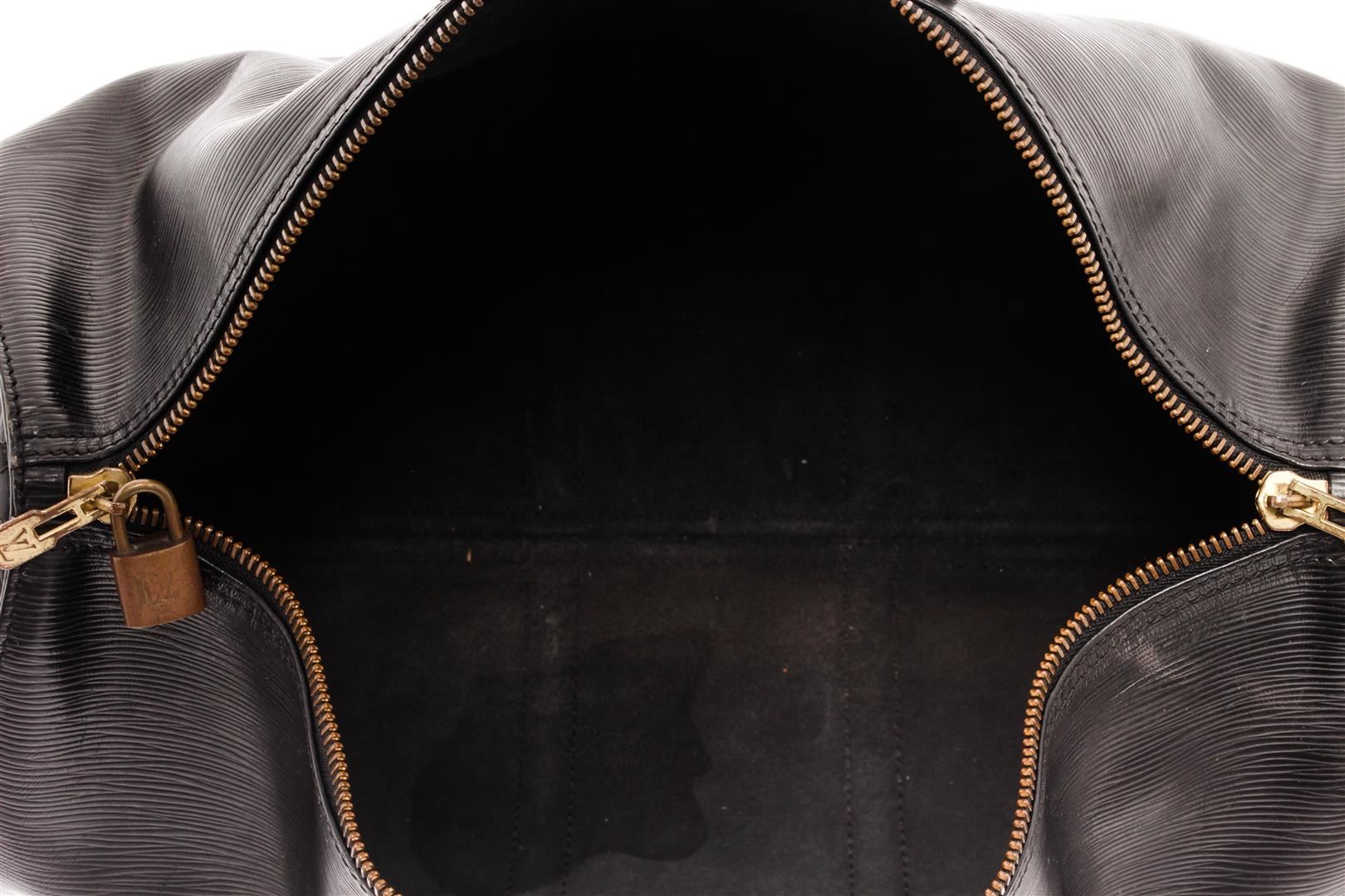 Louis Vuitton Black Epi Leather Keepall 50 Weekend/Travel Bag. All available information is listed in the description and shown in the photos. Louis Vuitton Black Epi Leather Keepall 50 Weekend/Travel Bag with black epi leather, brass hardware, rolled handles, single exterior pocket, unlined, zip closure at top. Height: 11", Width: 20", Depth: 8.5" / 27.94 x 50.8 x 21.59 CM