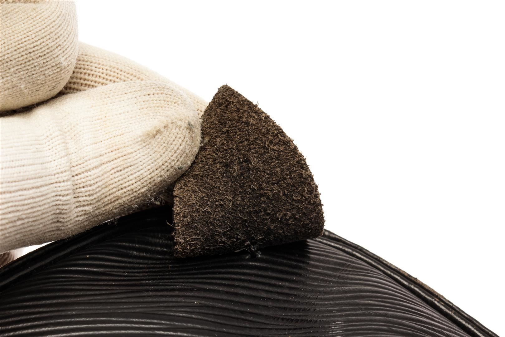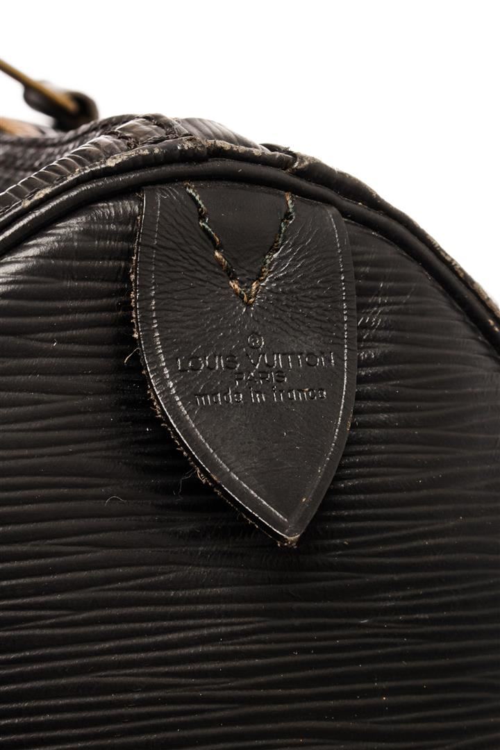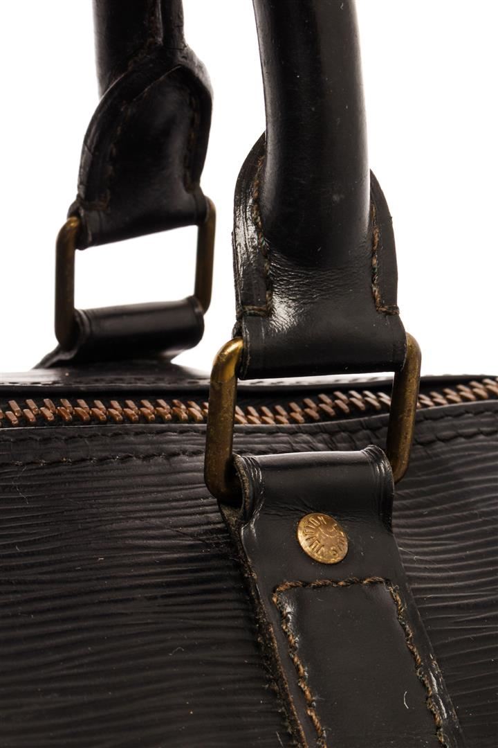 Louis Vuitton Black Epi Leather Keepall 50 Weekend/Travel Bag. All available information is listed in the description and shown in the photos. Louis Vuitton Black Epi Leather Keepall 50 Weekend/Travel Bag with black epi leather, brass hardware, rolled handles, single exterior pocket, unlined, zip closure at top. Height: 11", Width: 20", Depth: 8.5" / 27.94 x 50.8 x 21.59 CM