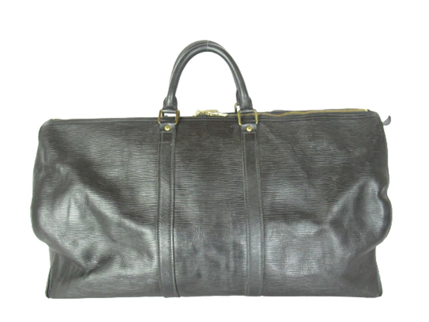Black Epi leather Louis Vuitton Keepall 55cm duffle bag with gold-tone hardware, dual rolled handles, black suede lining and zip closure at top. 22"x10"x12"xBag Drop:5"/55.8cmx25.4cmx30.4cmxBag Drop:12.7cm