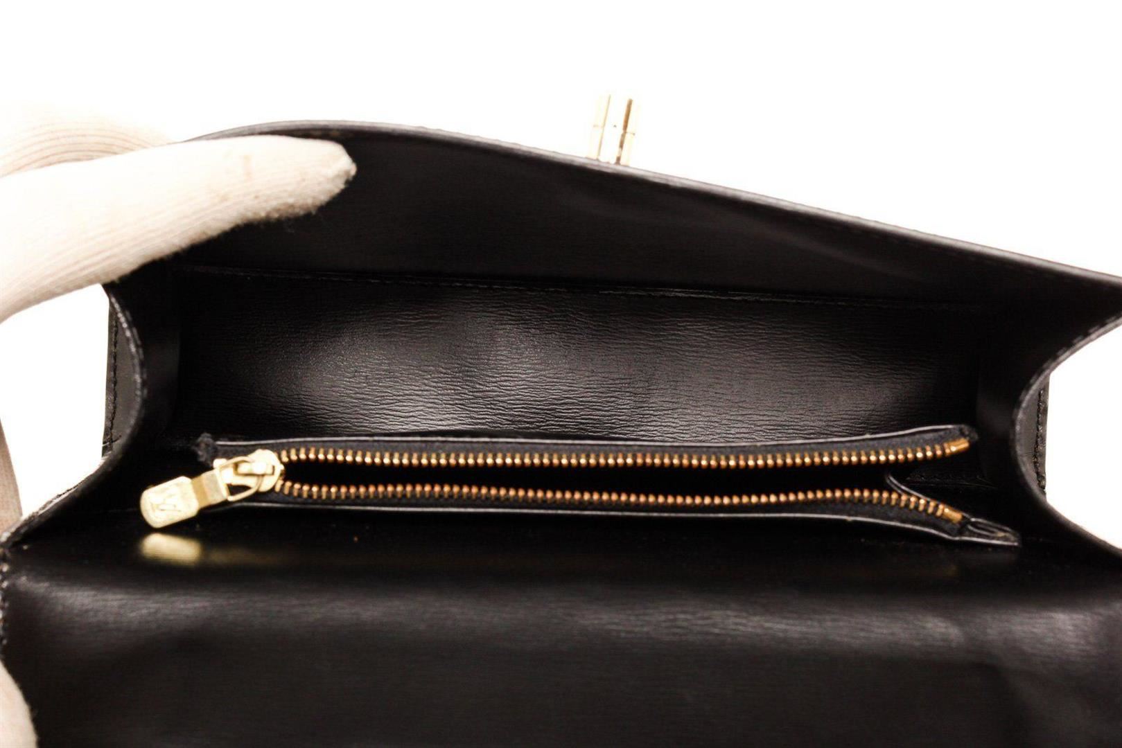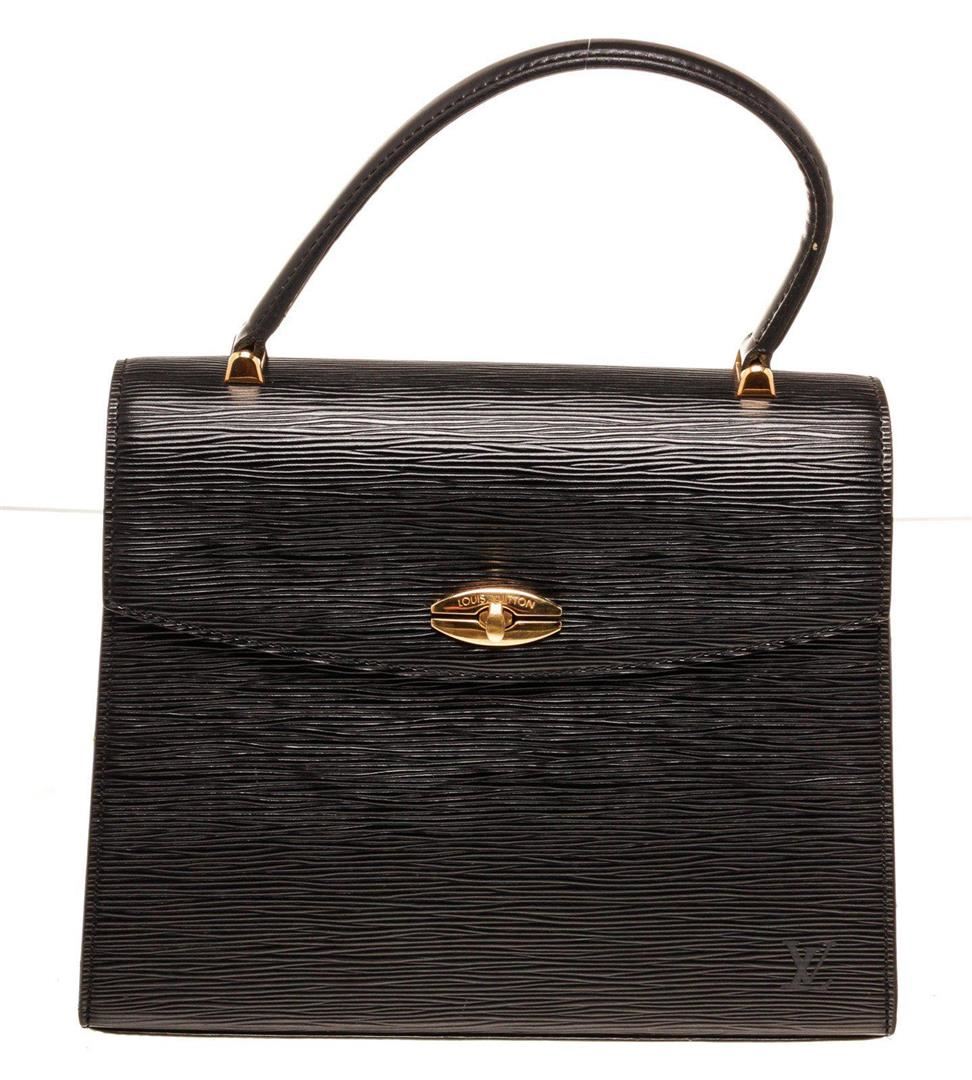 Louis Vuitton Black Epi Leather Malsherbes Shoulder Bag with epi leather, gold-tone hardware, single flat top handle, embossed logo at front corner, tonal leather lining, single zip pocket at interior wall and turn-lock closure at front flap.
