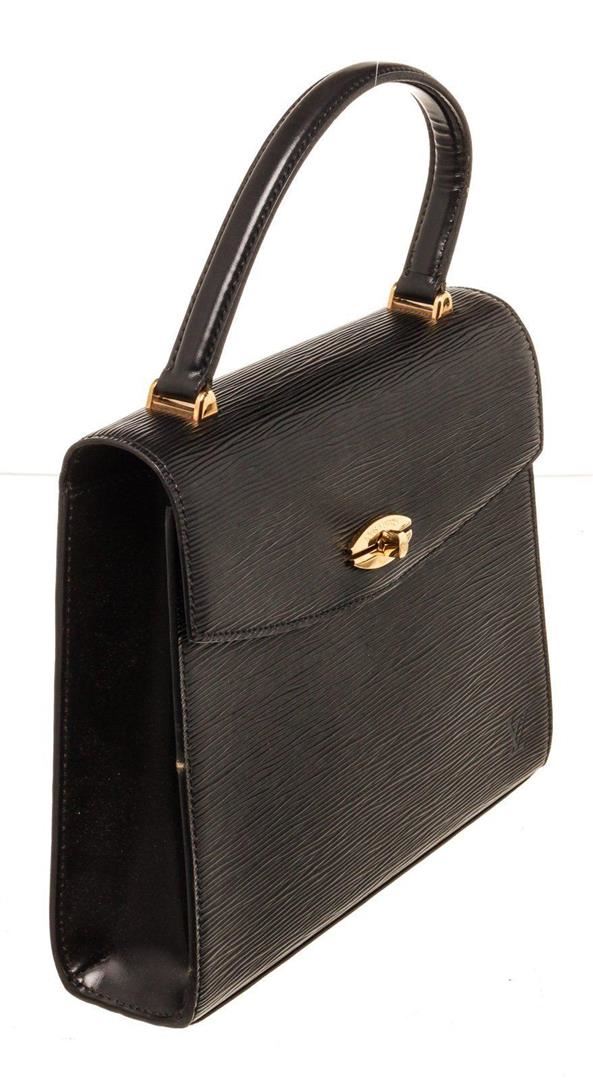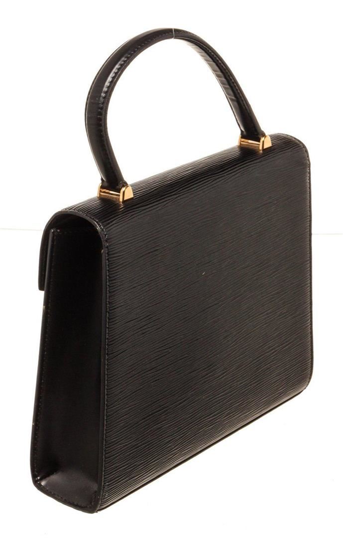 Louis Vuitton Black Epi Leather Malsherbes Shoulder Bag with epi leather, gold-tone hardware, single flat top handle, embossed logo at front corner, tonal leather lining, single zip pocket at interior wall and turn-lock closure at front flap.