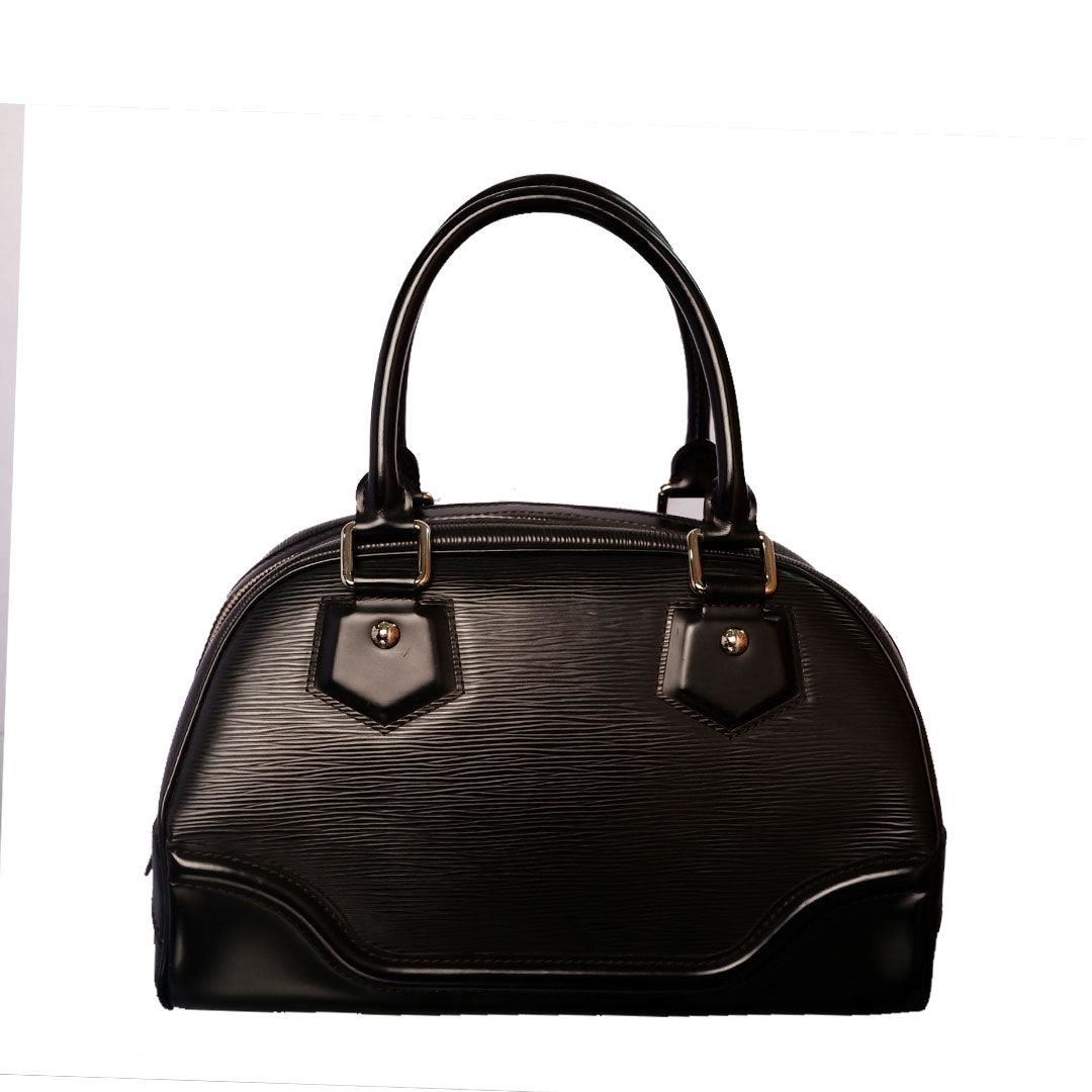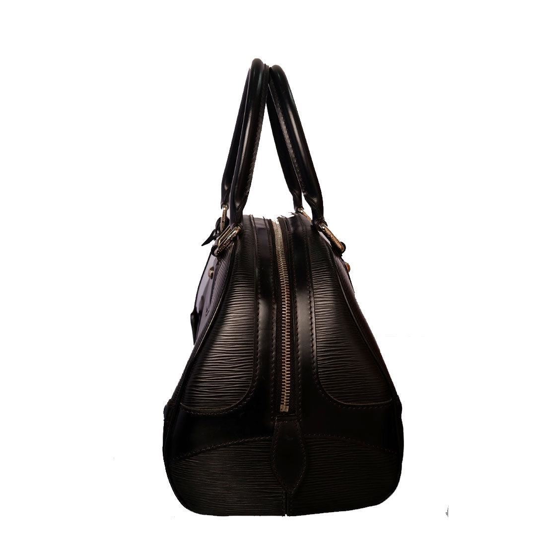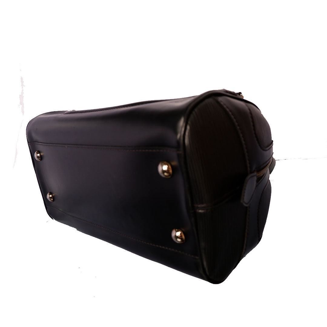Black Epi leather Louis Vuitton Montaigne Bowling GM bag with silver-tone hardware, dual rolled handles, zip-around closure at top, beige canvas lining single interior pocket and protective feet at base. Height 8.5" Width: 14.5" Depth: 6" Handl