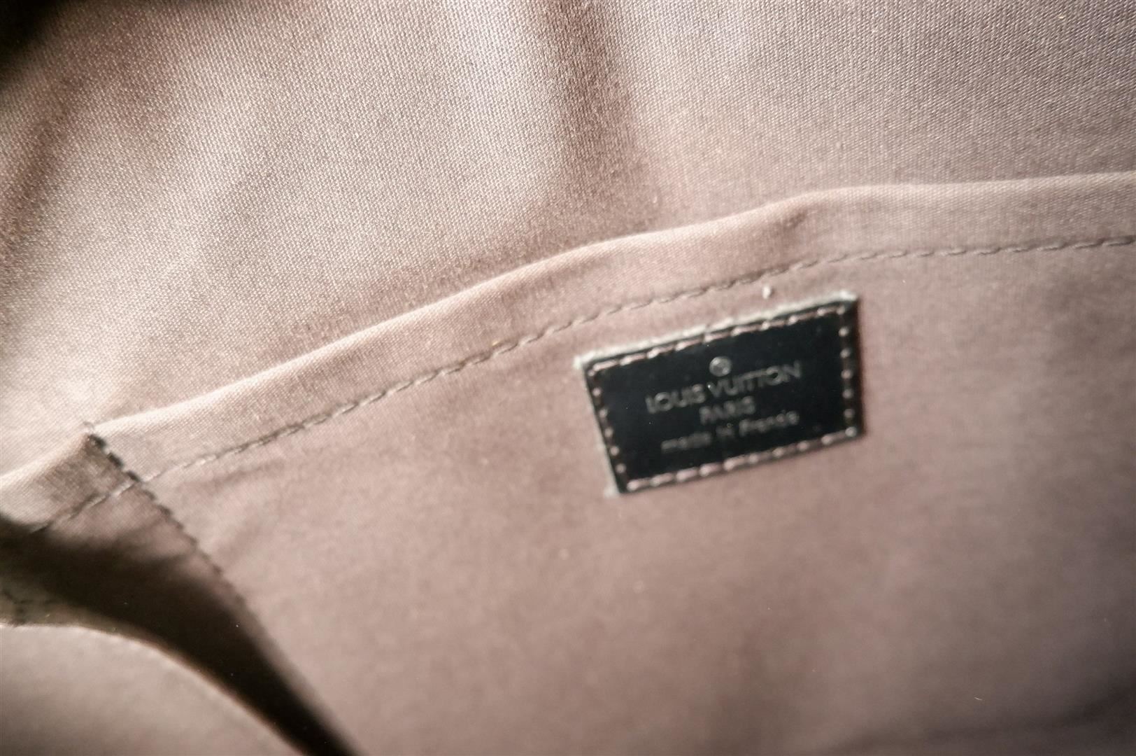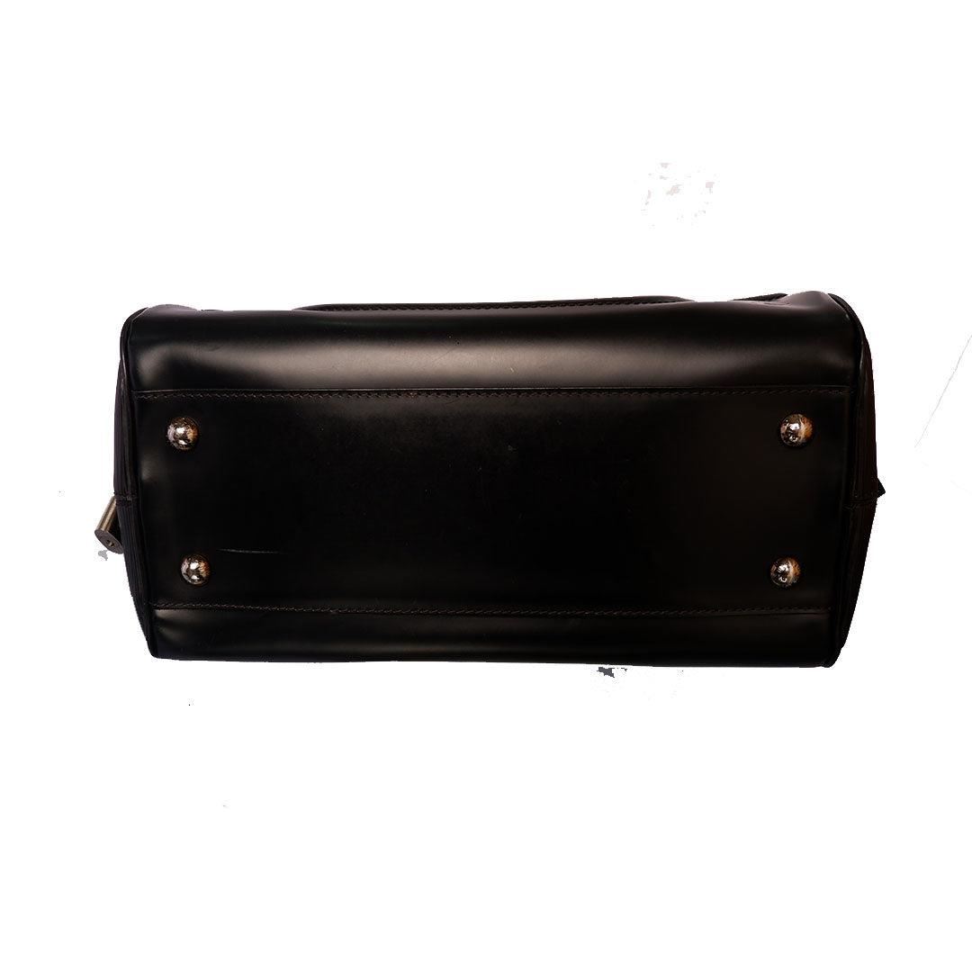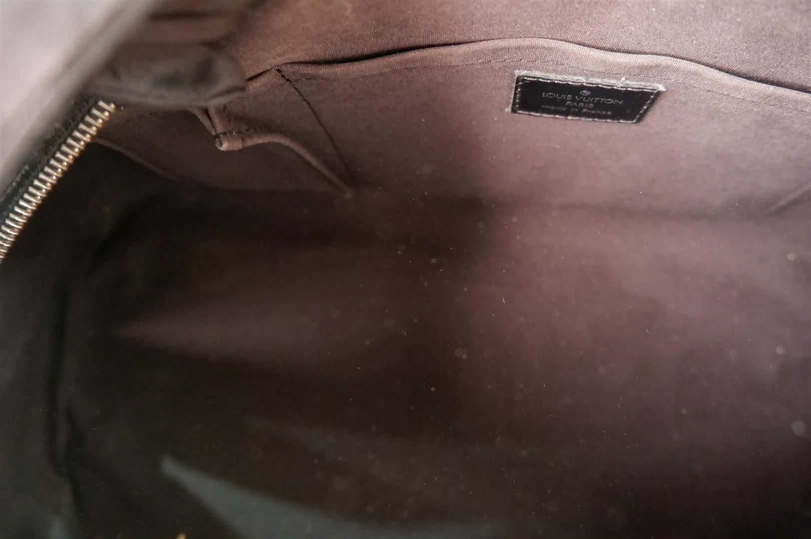 Black Epi leather Louis Vuitton Montaigne Bowling GM bag with silver-tone hardware, dual rolled handles, zip-around closure at top, beige canvas lining single interior pocket and protective feet at base. Height 8.5" Width: 14.5" Depth: 6" Handl