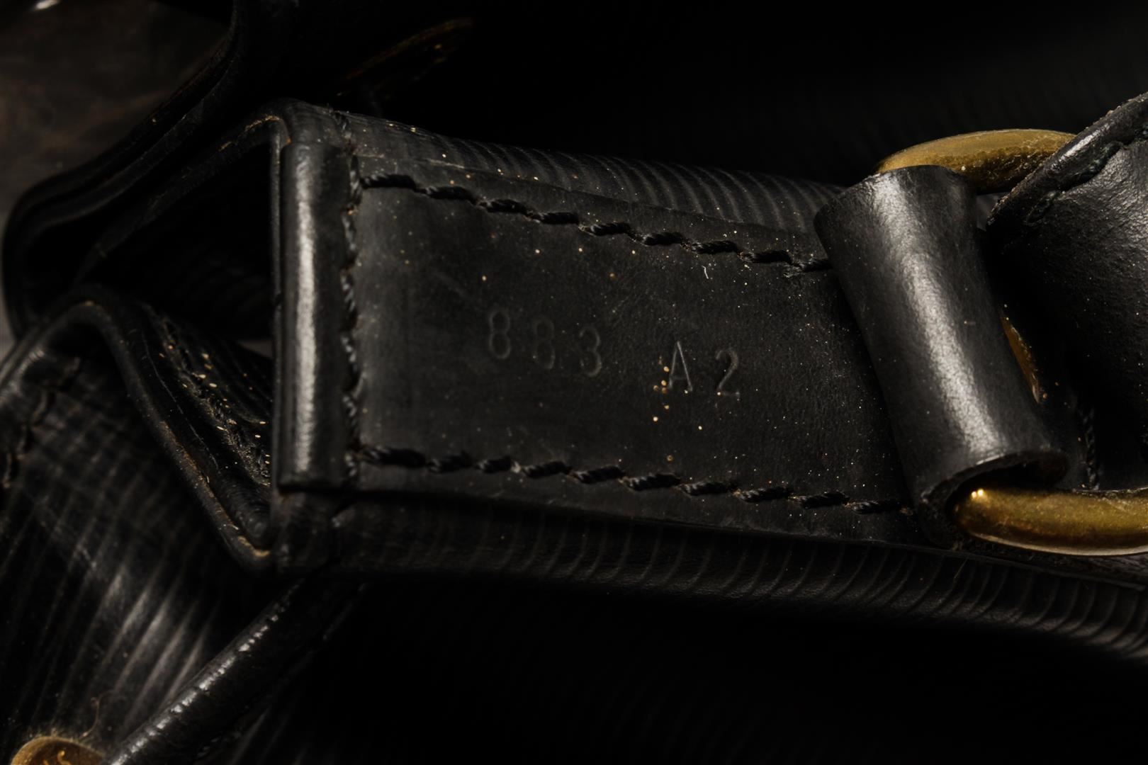 One Louis Vuitton Black Epi Leather Noe Bucket Bag. Item is sold AS-IS. All available information is listed in the description and shown in the photo. Louis Vuitton Black Epi Leather Noe Bucket Bag with gold-tone hardware, leather trim, black suede lining, single adjustable black leather shoulder strap, and drawstring closure. .