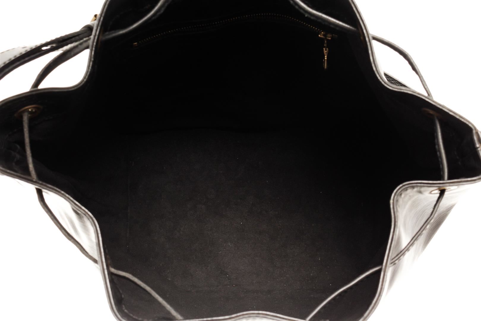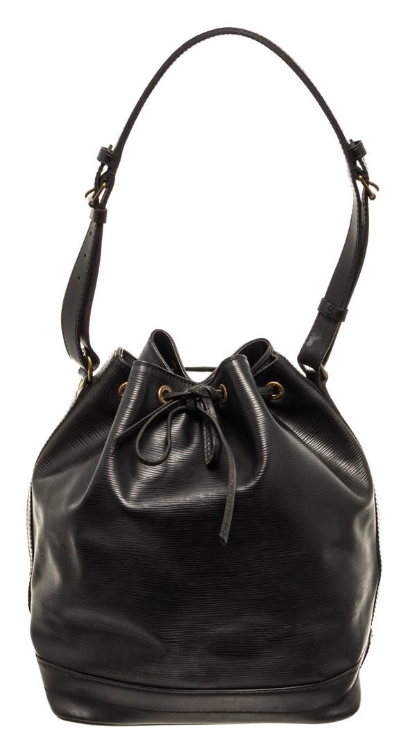 One Louis Vuitton Black Epi Leather Noe Bucket Bag. Item is sold AS-IS. All available information is listed in the description and shown in the photo. Louis Vuitton Black Epi Leather Noe Bucket Bag with gold-tone hardware, leather trim, black suede lining, single adjustable black leather shoulder strap, and drawstring closure. .