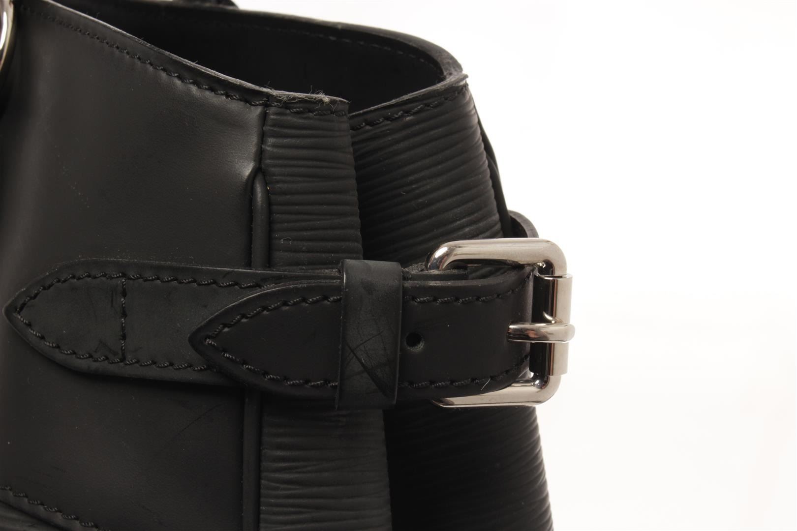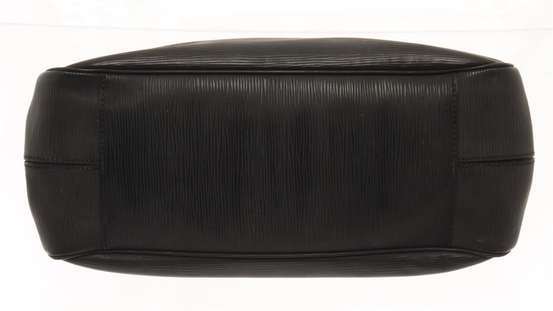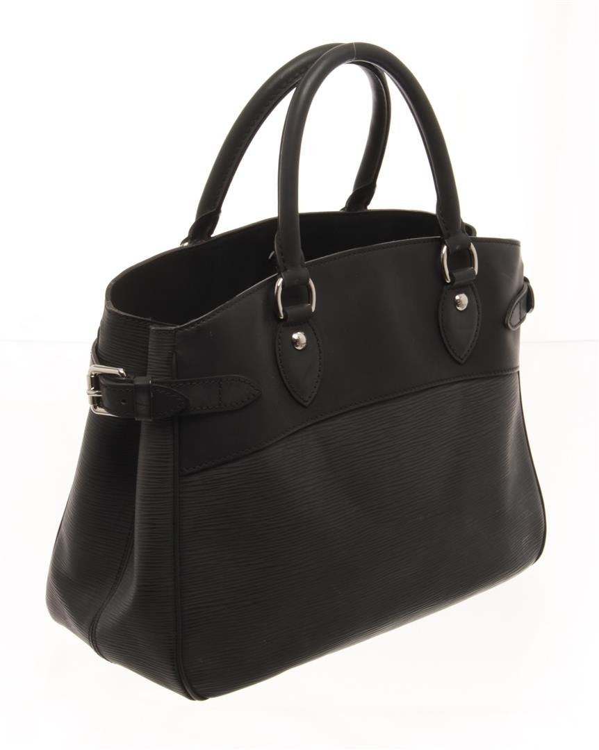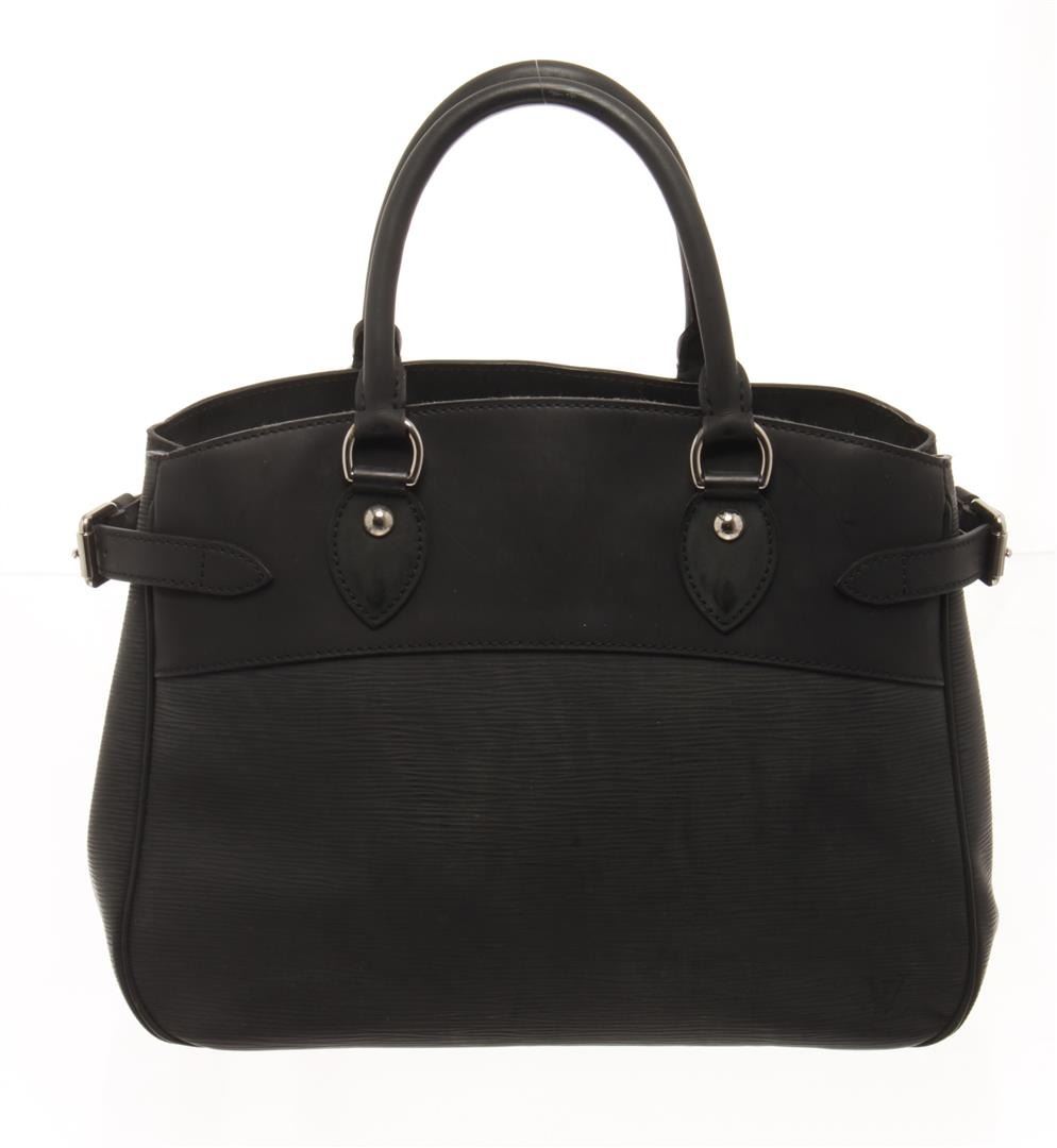One Louis Vuitton Black Epi Leather Passy Handbag. Item is sold AS-IS. All available information is listed in the description and shown in the photo. louis vuitton black leather passy handbag with black epi leather, silver-tone hardware, rolled handles, canvas lining & three interior pockets, clasp closure at top. Height: 10.25", Width: 15", Depth: 5.5" / 26.03 x 38.1 x 13.97 cm