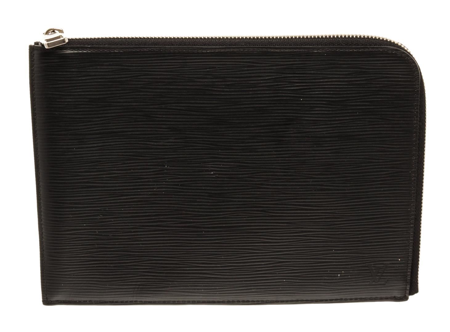 Louis Vuitton Black Epi Leather Pochette Jour PM Clutch Bag. All available information is listed in the description and shown in the photos. Louis Vuitton Black Epi Leather Pochette Jour PM Clutch Bag with Zip opening, silver tone hardware, microfiber lining, open pocket. 14" x 10.25" x 1" Inches / 35.5 x 26.0 x 2.54 Cm