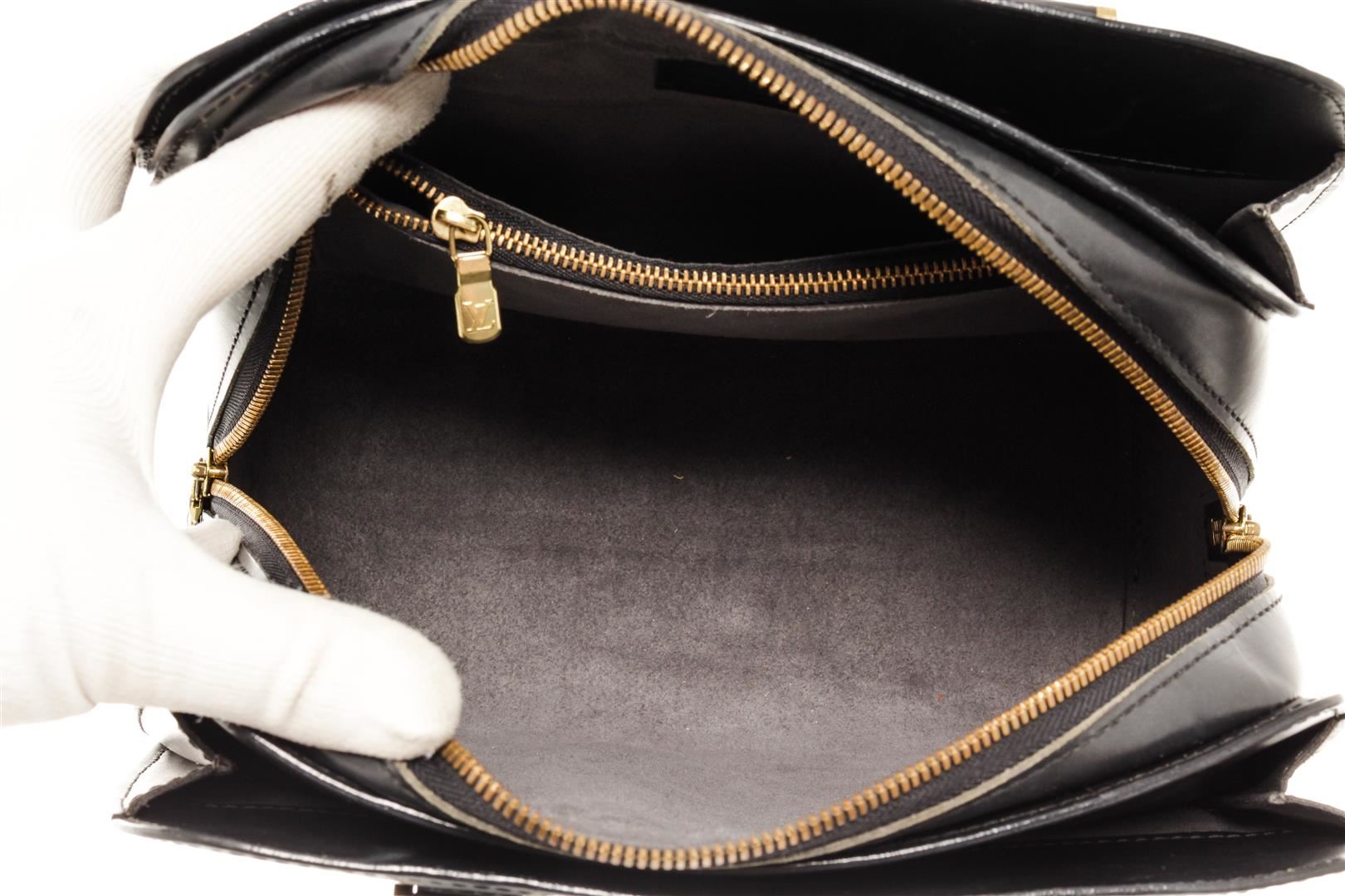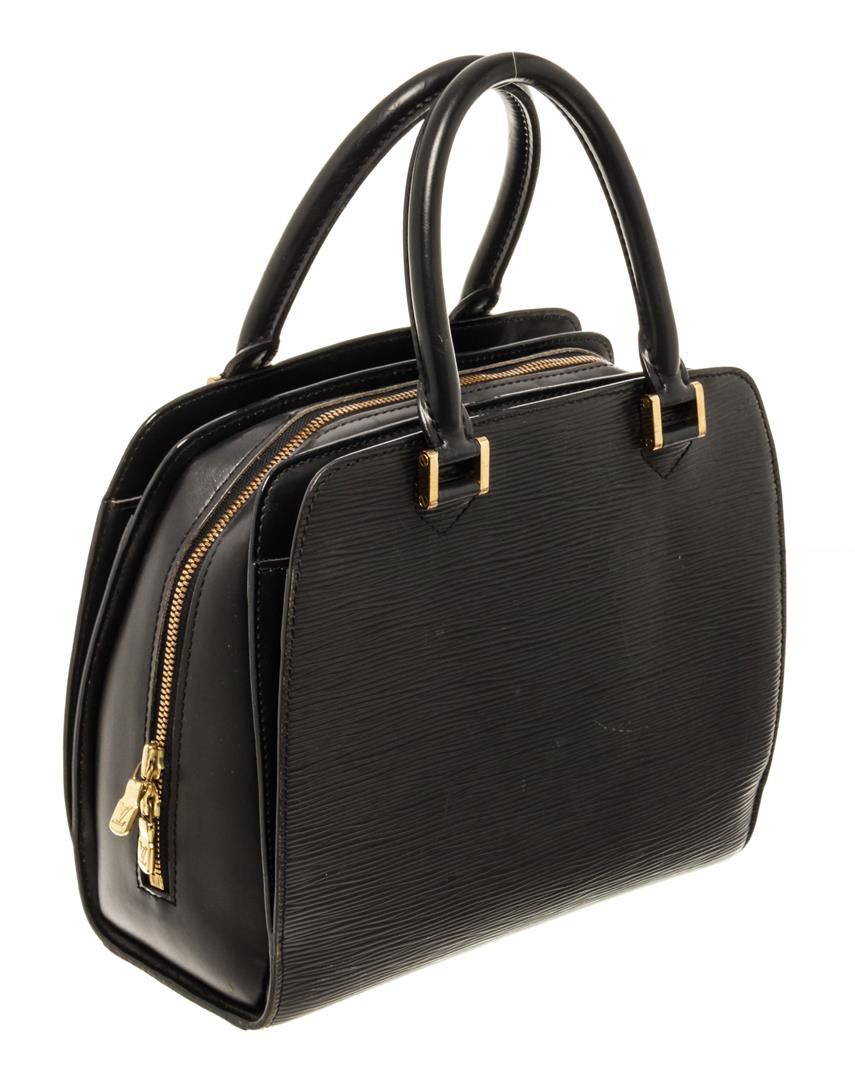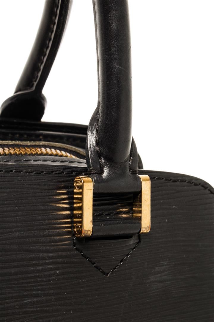 One Louis Vuitton Black Epi Leather Pont Neuf Satchel Bag. Item is sold AS-IS. All available information is listed in the description and shown in the photo. Louis Vuitton Black Epi Leather Pont Neuf Satchel Bag with gold-tone hardware, embossed LV logo at the bottom front, grey alcantara lining, interior zipper pocket, dual rolled leather top handles, and zip closure at the top. .