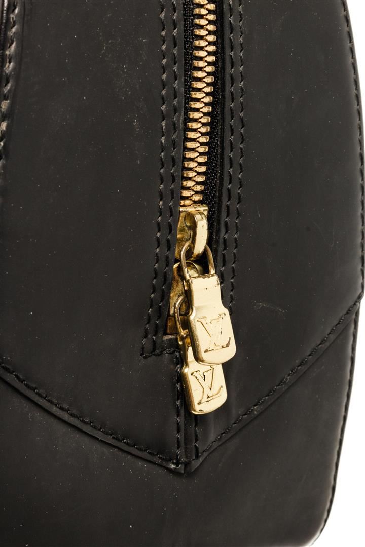 One Louis Vuitton Black Epi Leather Pont Neuf Satchel Bag. Item is sold AS-IS. All available information is listed in the description and shown in the photo. This sophisticated tote is finely crafted of Louis Vuitton signature textured black epi leather. The bag features thin and sturdy rolled leather top handles with squared brass links, and a wrap around zipper. This handbag opens to a alcantara microfiber interior with zipper and patch pockets.