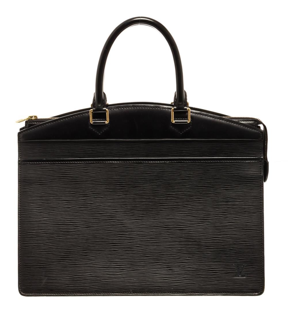 One Louis Vuitton Black Epi Leather Riviera Handbag. Item is sold AS-IS. All available information is listed in the description and shown in the photo. Black Epi leather Louis Vuitton Riviera Bag with silver-tone hardware, single pocket at front exterior, dual rolled leather top handles, black leather lining, four pockets at interior walls, elastic holders at interior and zip closure at top.