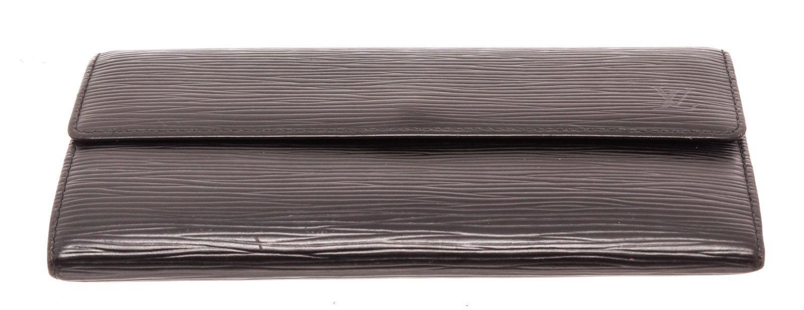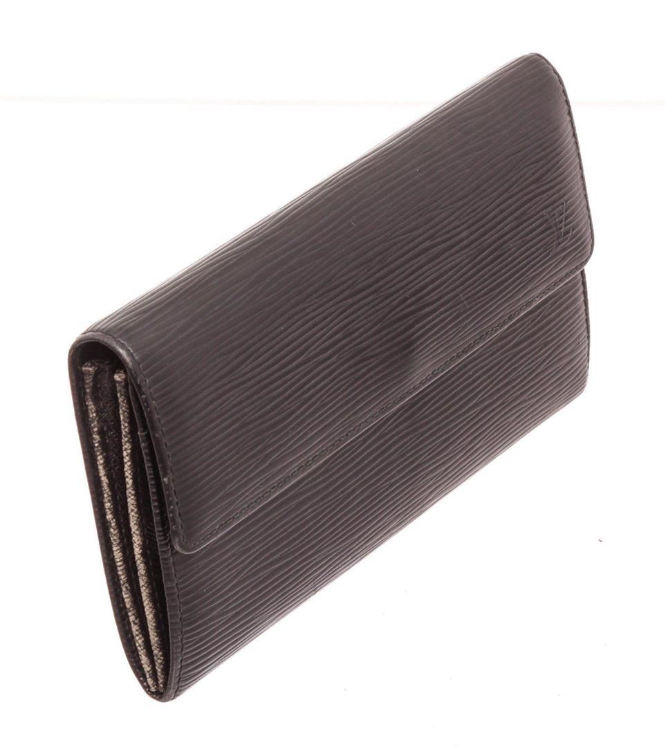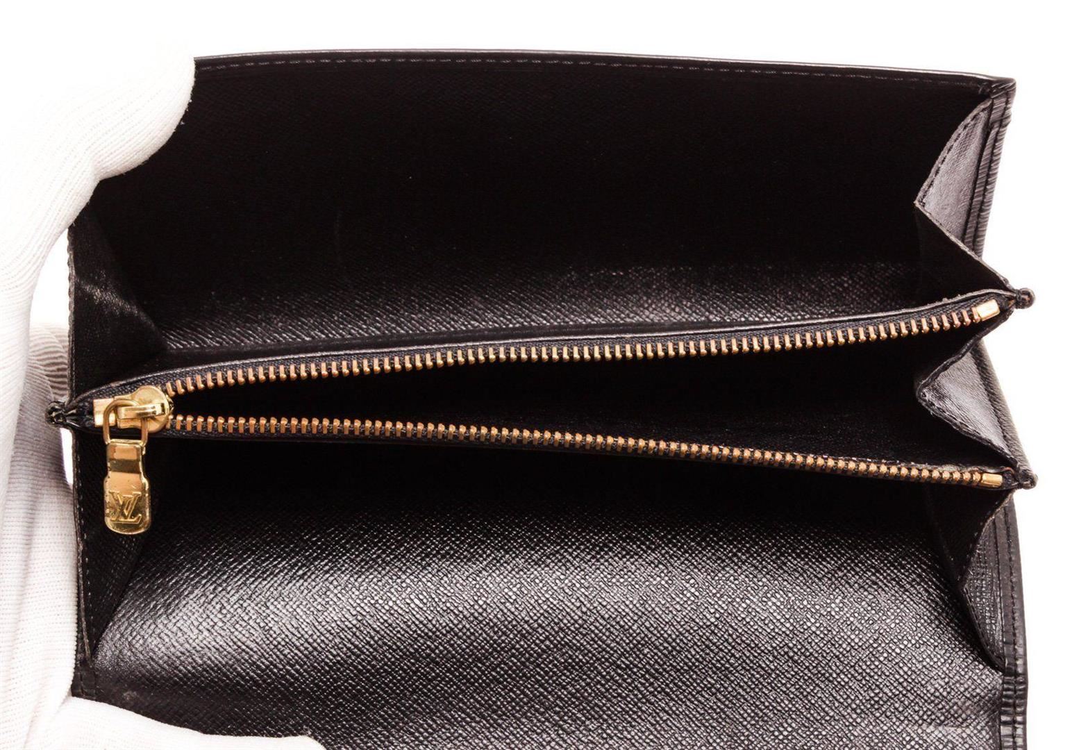 Louis Vuitton Black Epi Leather Sarah Wallet with silver-tone hardware, leather lining, interior pockets, ten card slots, and snap closure at front. Measurements: Length: 1 in / 3 cm Width: 7.5 in / 19 cm 4 in / 10 cm Condition: Pre-Owned Good overall, please see photographs for detail.