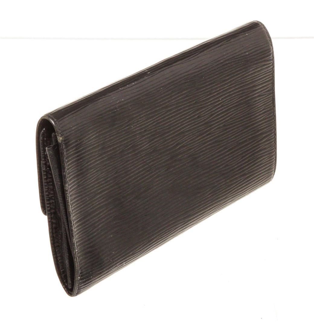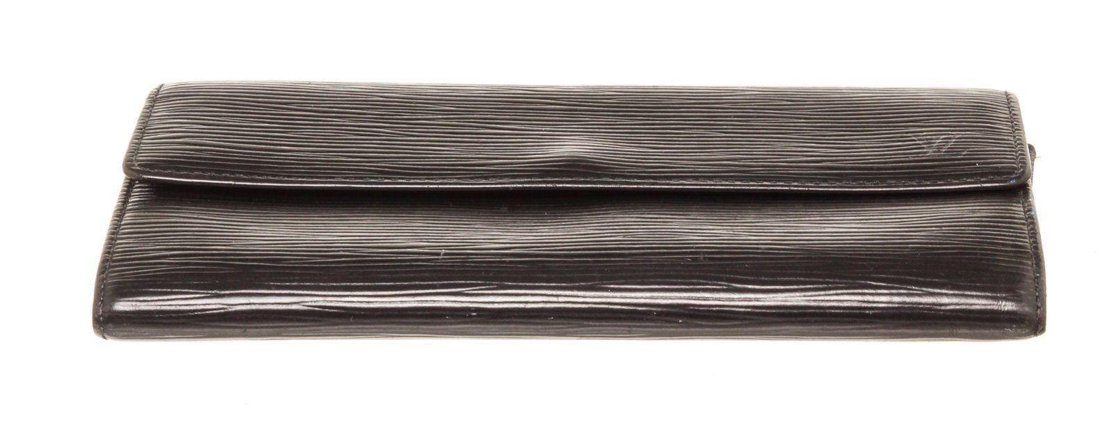 Louis Vuitton Black Epi Leather Sarah Wallet with material epi leather, gold-tone hardware, three interior compartments pockets, trim tan vachetta leather, snap closure.