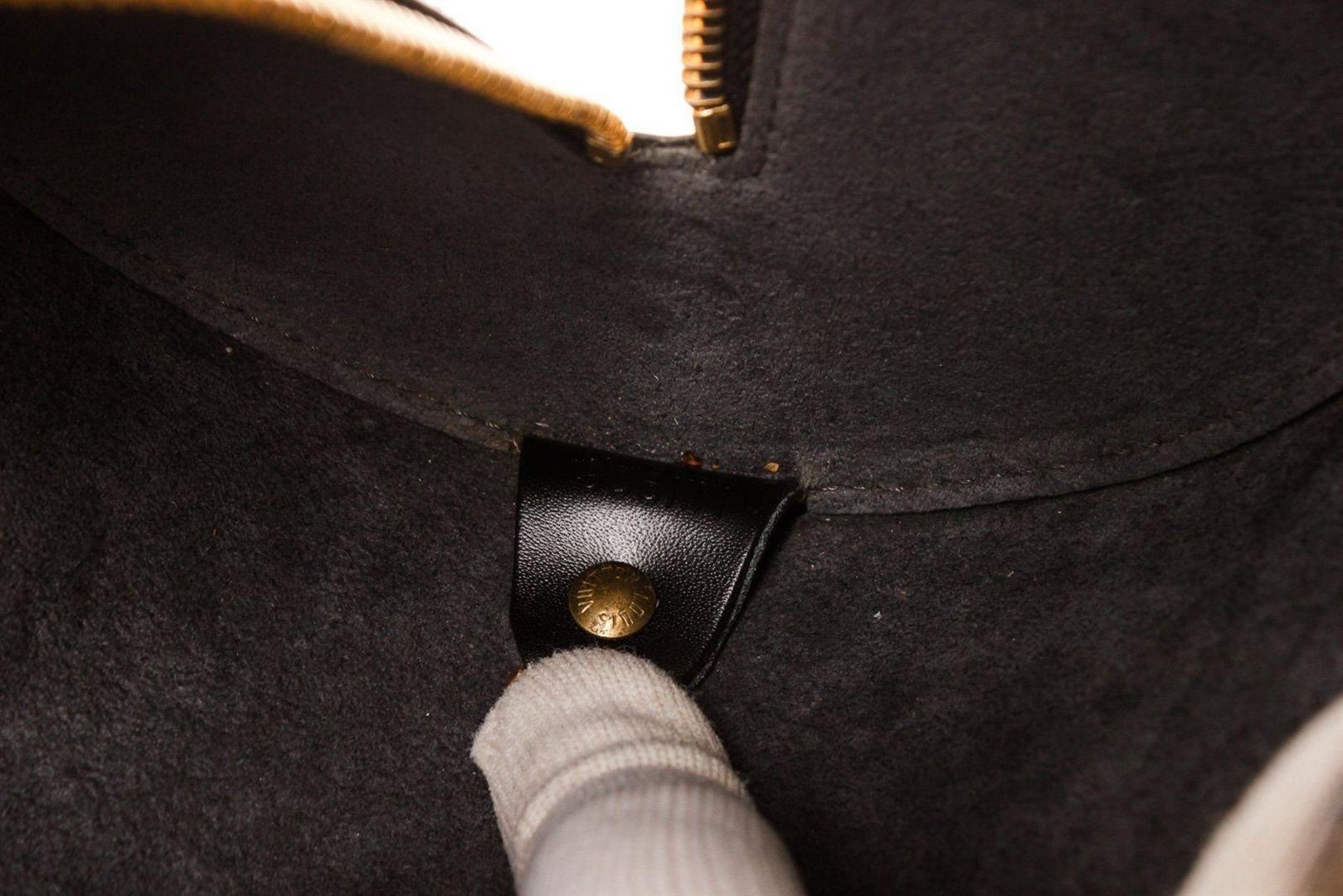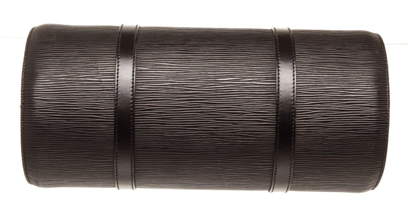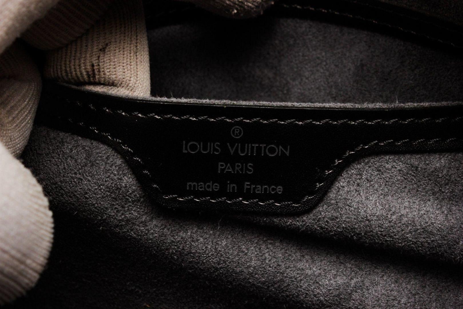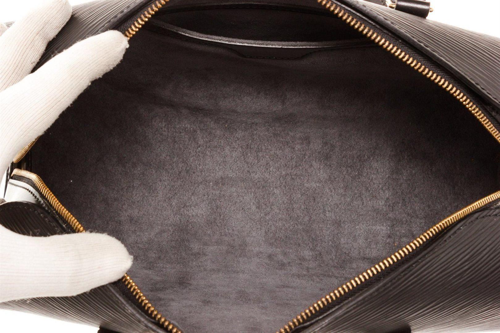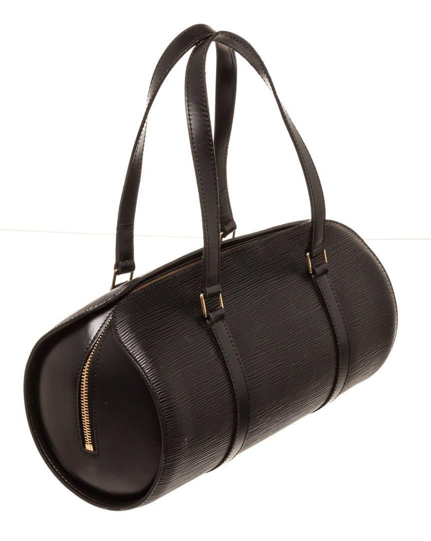 Louis Vuitton Black Epi Leather Soufflot Shoulder Bag with material epi leather, gold-tone hardware, trim tan vachetta leather, interior slip pocket, shoulder strap and zipper closure.