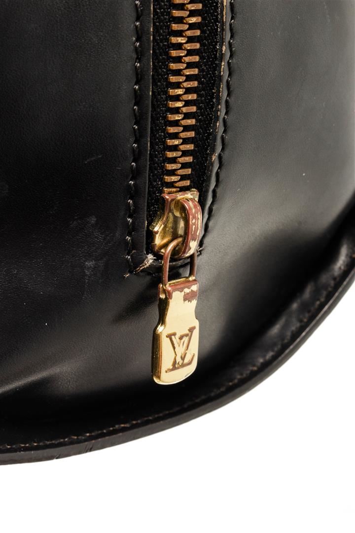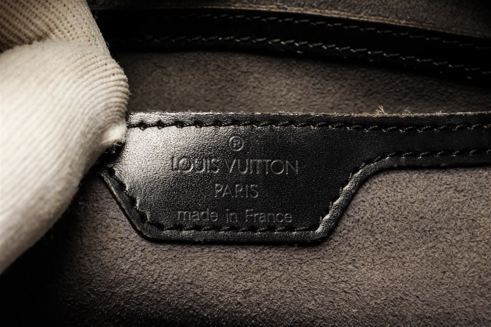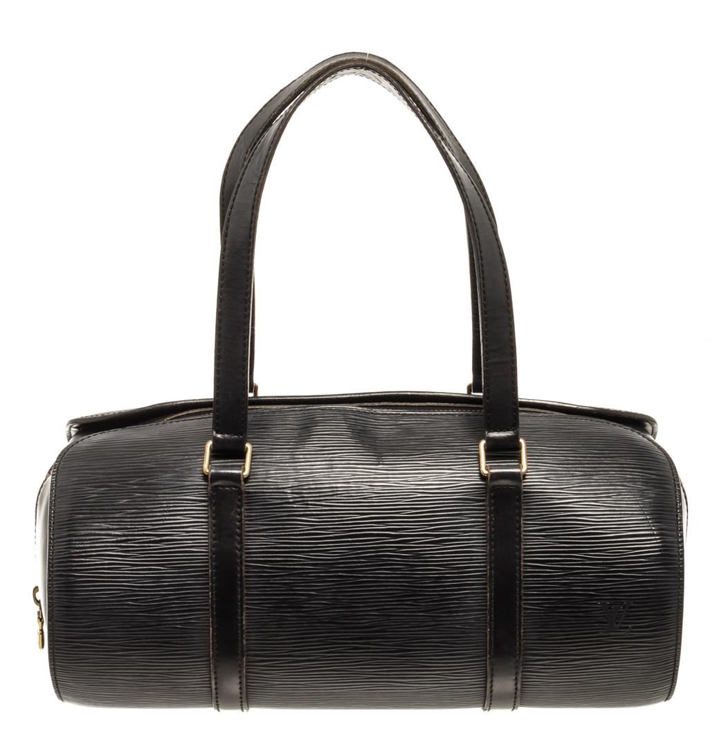 One Louis Vuitton Black Epi Leather Soufflot Shoulder Bag. Item is sold AS-IS. All available information is listed in the description and shown in the photo. Louis Vuitton Black Epi Leather Soufflot Shoulder Bag with material epi leather, gold-tone hardware, trim tan vachetta leather, grey alcantara lining, interior slip pocket, dual flat leather shoulder strap and zipper closure. .