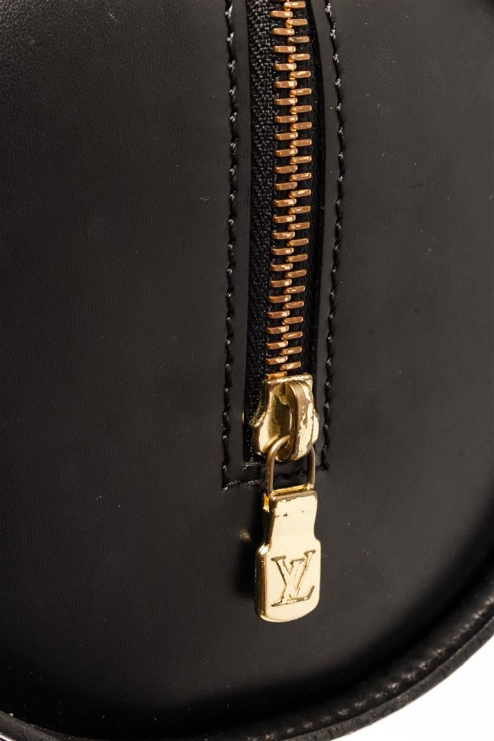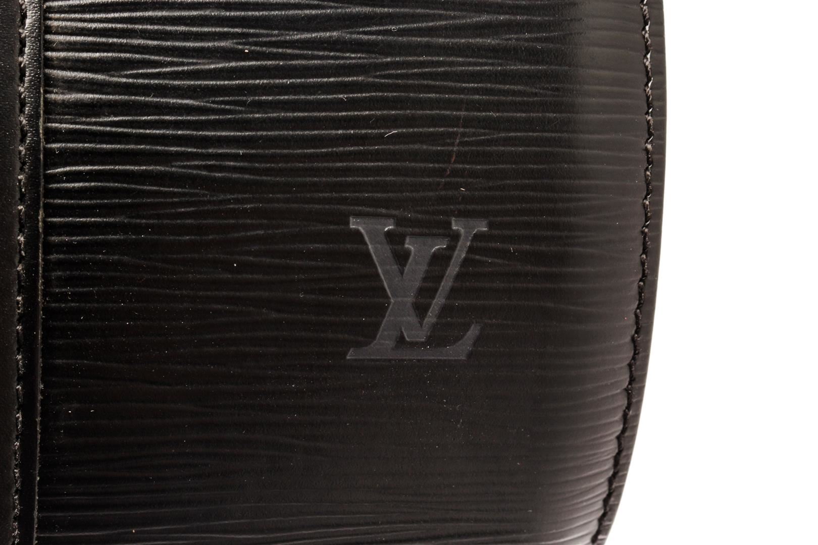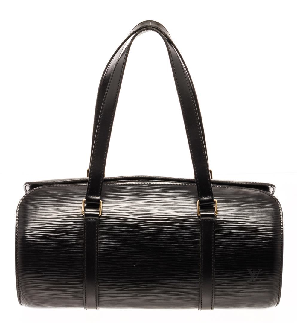 One Louis Vuitton Black Epi Leather Soufflot Tote Bag. Item is sold AS-IS. All available information is listed in the description and shown in the photo. Louis Vuitton Black Epi Leather Soufflot Tote Bag with top handle, suede lining, interior pocket, gold tone hardware, zip closure. Depth 3.9 in, Height 4.7 in, Width 11.8 in, Handle 6.7 in/ Depth 10 cm, Height 12 cm, Width 30 cm, Handle 17 cm