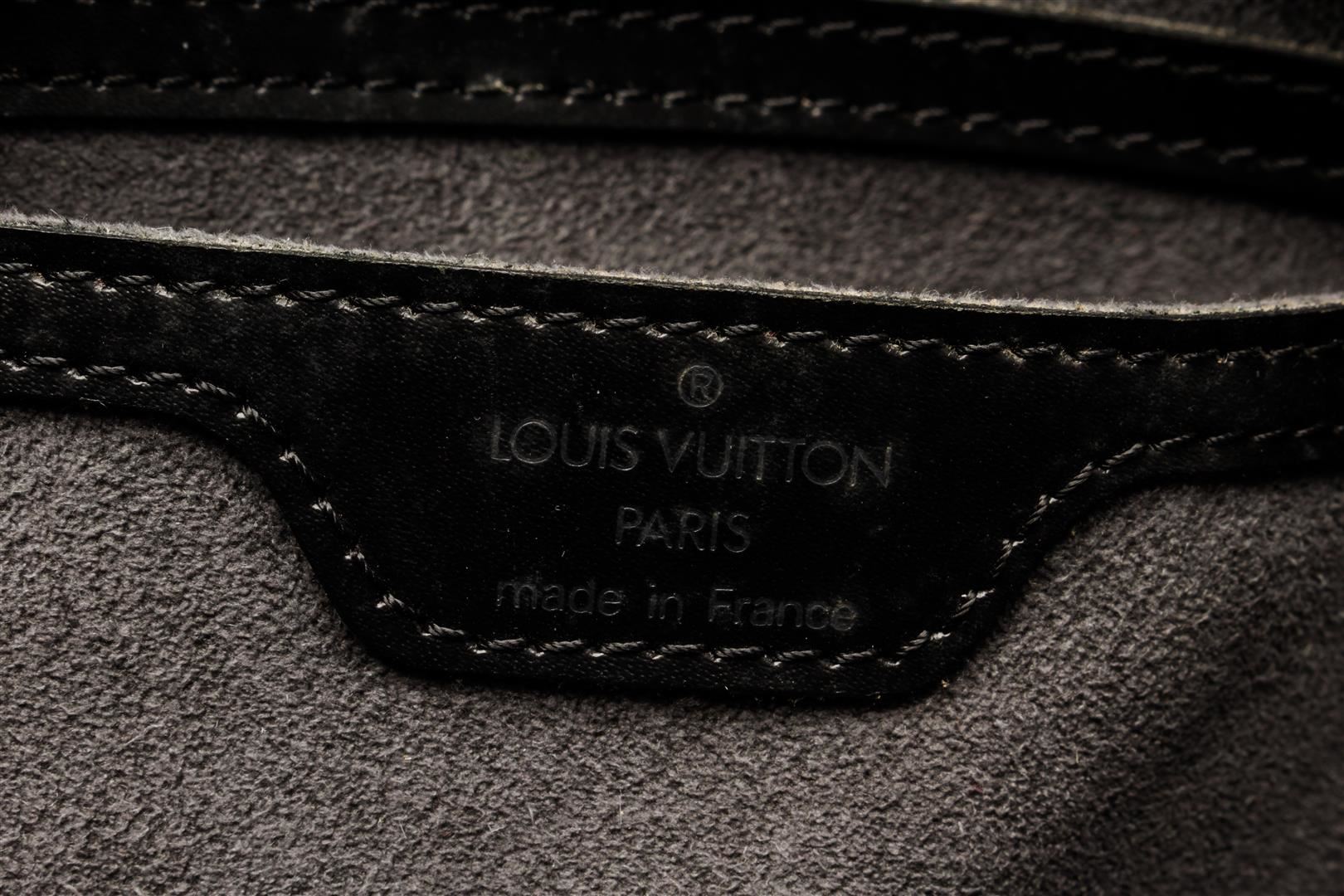 One Louis Vuitton Black Epi Leather Soufflot Tote Bag. Item is sold AS-IS. All available information is listed in the description and shown in the photo. Louis Vuitton Black Epi Leather Soufflot Tote Bag with top handle, suede lining, interior pocket, gold tone hardware, zip closure. Depth 3.9 in, Height 4.7 in, Width 11.8 in, Handle 6.7 in/ Depth 10 cm, Height 12 cm, Width 30 cm, Handle 17 cm