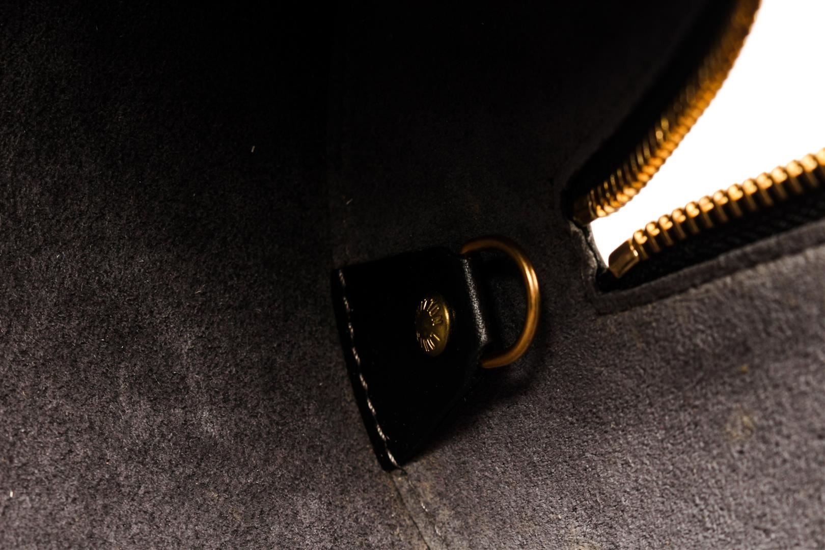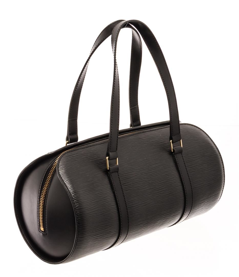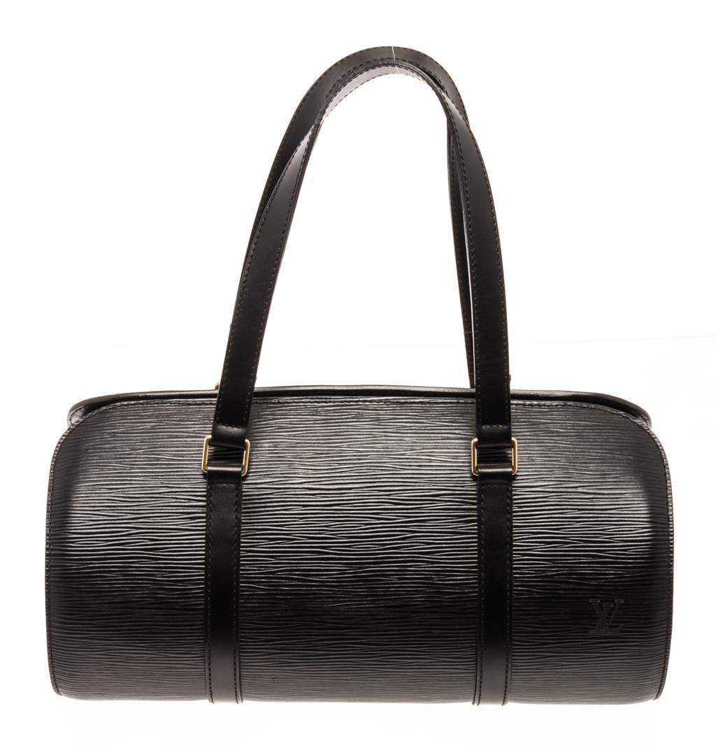 One Louis Vuitton Black Epi Leather Soufflot Tote Bag. Item is sold AS-IS. All available information is listed in the description and shown in the photo. Louis Vuitton Black Epi Leather Soufflot Tote Bag with gold-tone hardware, shoulder strap, suede lining, zipper closure. Depth 3.9 in, Height 4.7 in, Width 11.8 in, Handle 6.7 in/ Depth 10 cm, Height 12 cm, Width 30 cm, Handle 17 cm