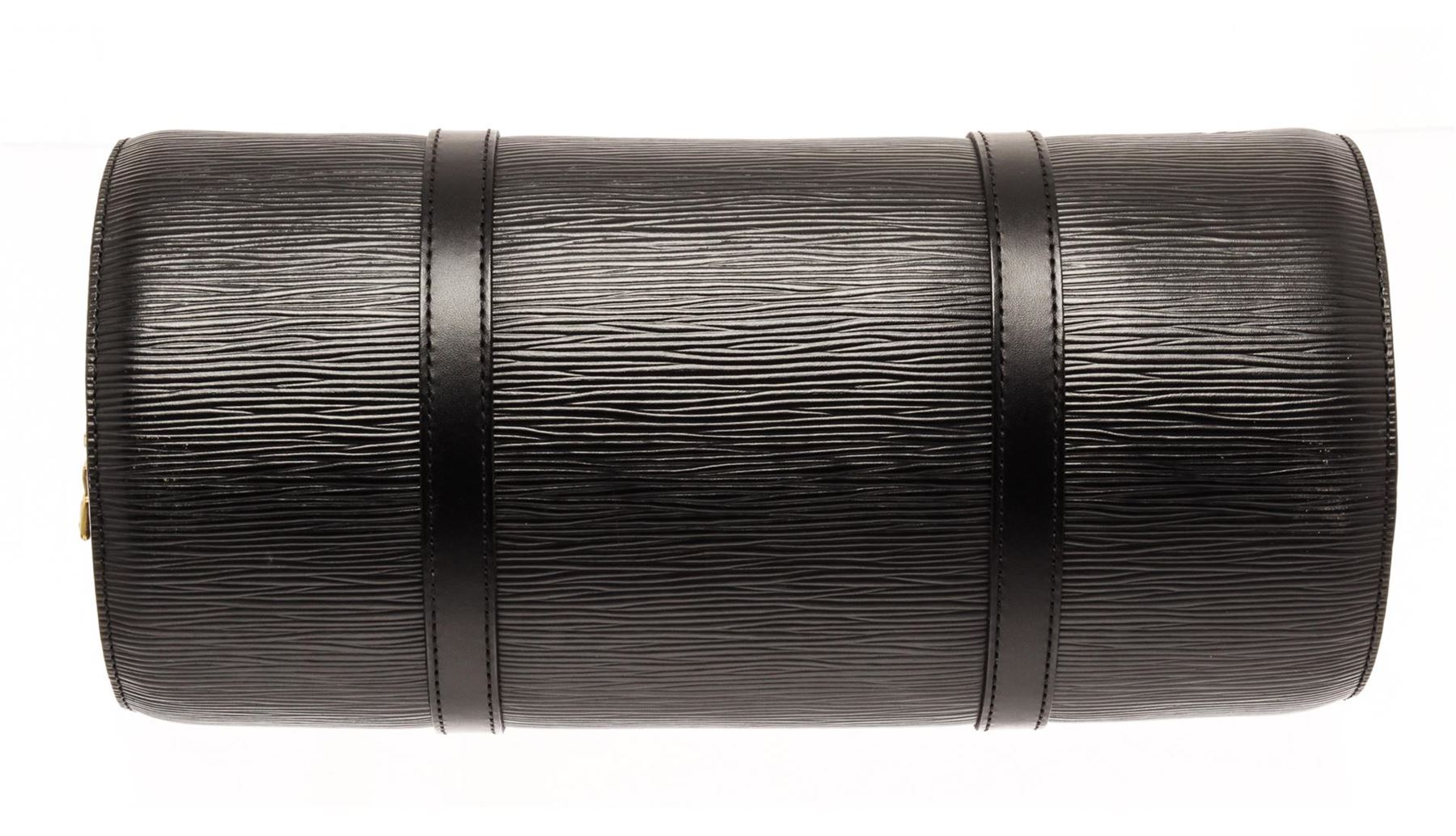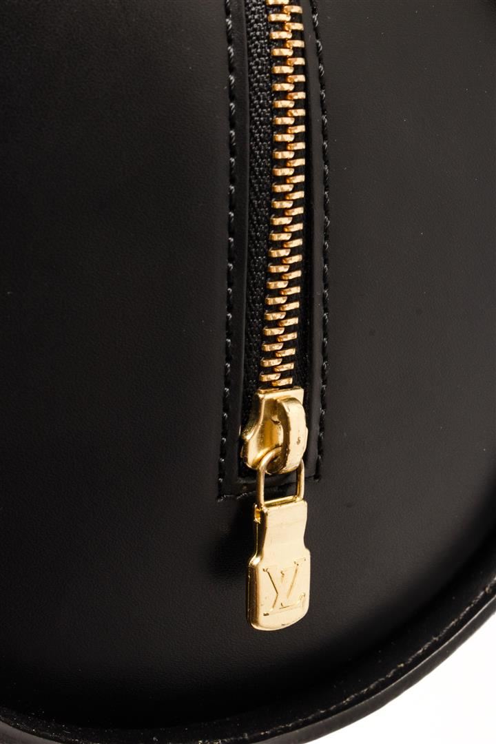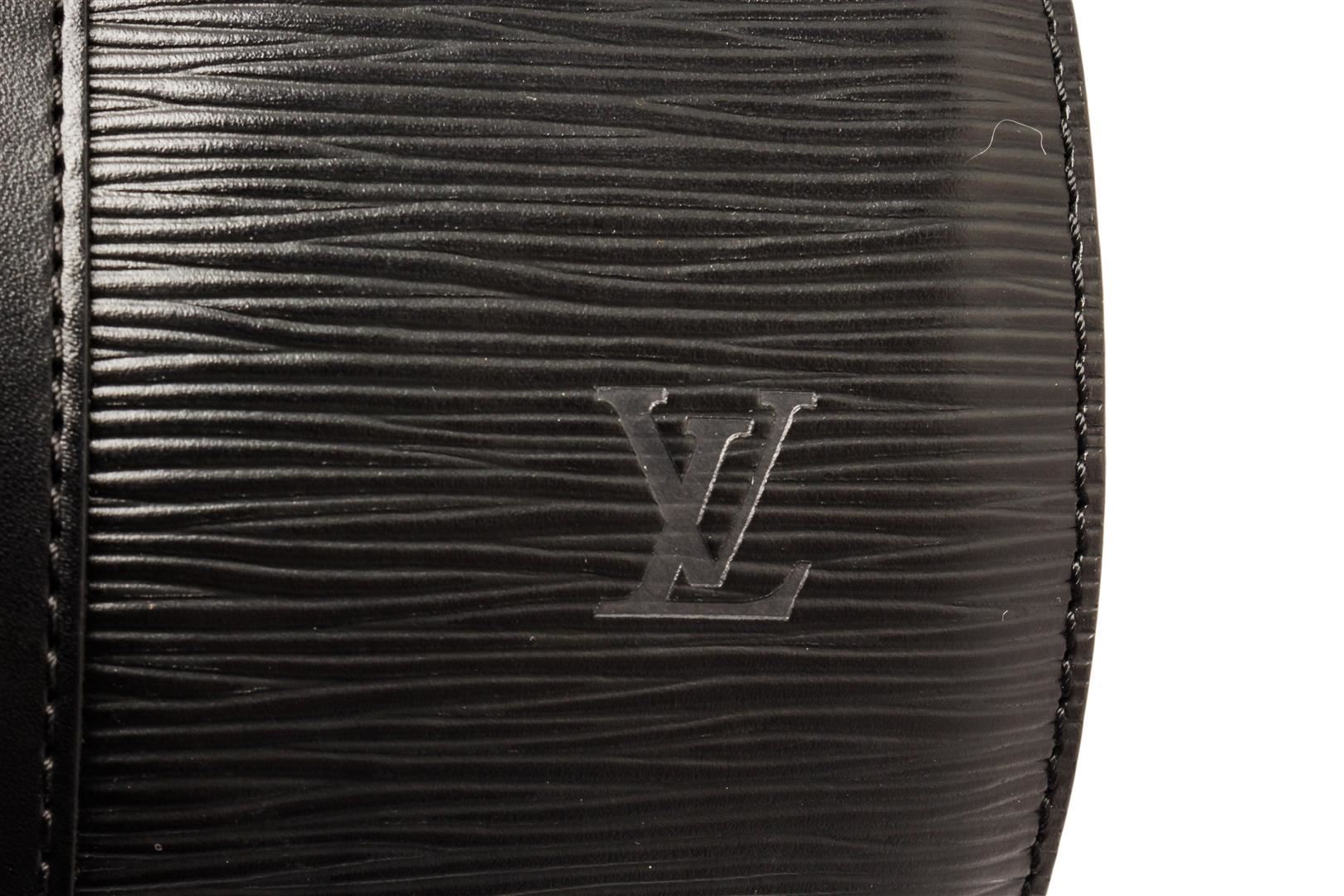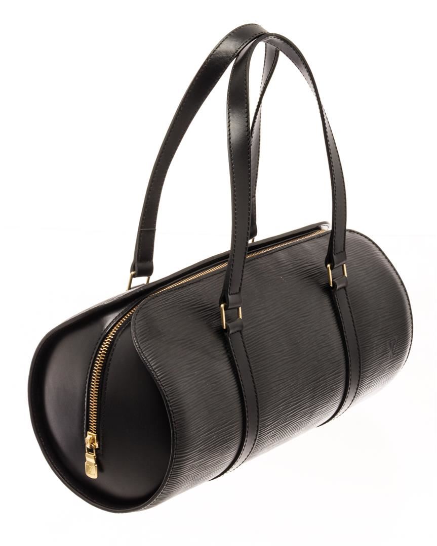 One Louis Vuitton Black Epi Leather Soufflot Tote Bag. Item is sold AS-IS. All available information is listed in the description and shown in the photo. Louis Vuitton Black Epi Leather Soufflot Tote Bag with gold-tone hardware, shoulder strap, suede lining, zipper closure. Depth 3.9 in, Height 4.7 in, Width 11.8 in, Handle 6.7 in/ Depth 10 cm, Height 12 cm, Width 30 cm, Handle 17 cm