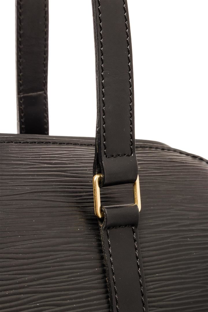 One Louis Vuitton Black Epi Leather Soufflot Tote Bag. Item is sold AS-IS. All available information is listed in the description and shown in the photo. Louis Vuitton Black Epi Leather Soufflot Tote Bag with gold-tone hardware, shoulder strap, suede lining, zipper closure. Depth 3.9 in, Height 4.7 in, Width 11.8 in, Handle 6.7 in/ Depth 10 cm, Height 12 cm, Width 30 cm, Handle 17 cm