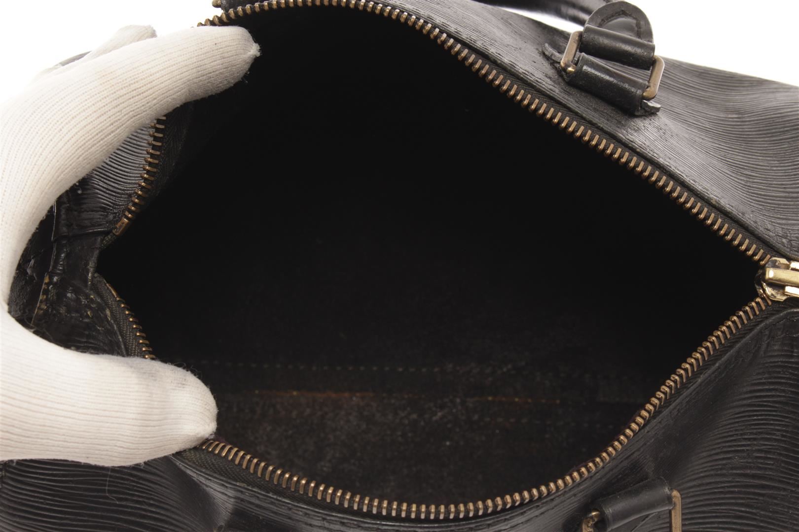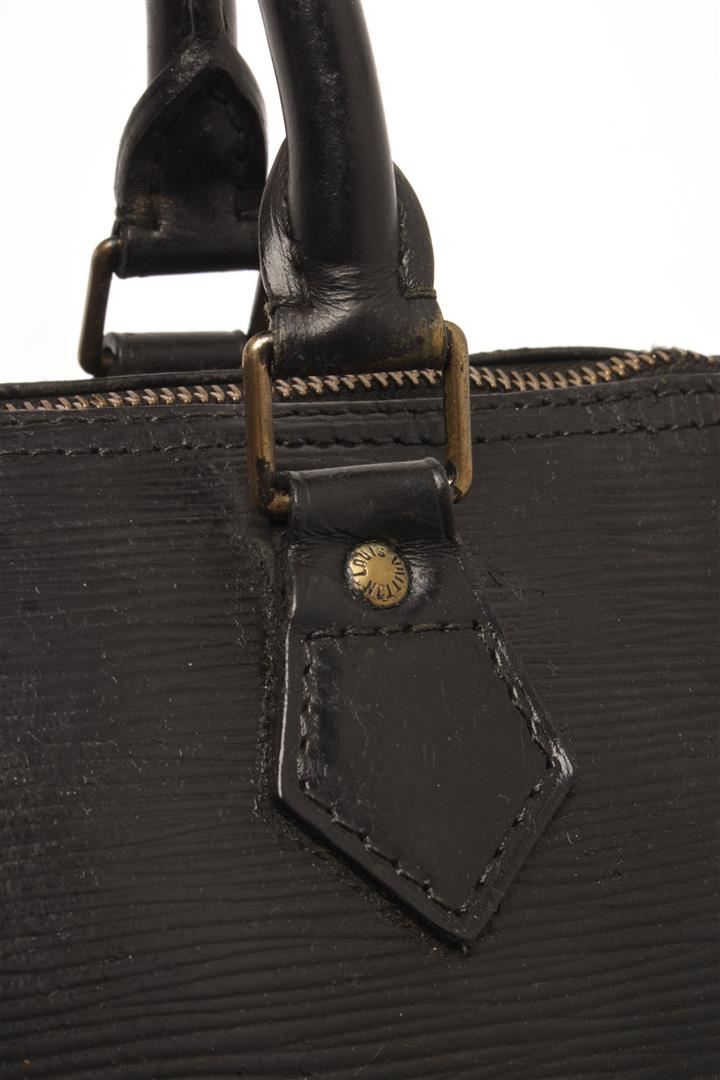 One Louis Vuitton Black Epi Leather Speedy 35 Satchel Bag. Item is sold AS-IS. All available information is listed in the description and shown in the photo. Louis Vuitton Black Epi Leather Speedy 35 Satchel Bag with gold-tone hardware, epi leather body, an exterior side slip pocket, rolled handles, a top zip closure, and an interior pocket. PLEASE NOTE: Bag has been redyed. There are creases on the leather throughout. There are markings on the leather. Please refer to photos. (HxWxD): 23.5cm x 37.5cm x 19.5cm / 9.25'' x 14.76'' x 7.67''