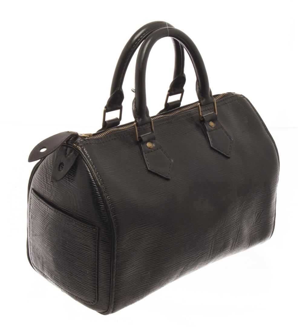 One Louis Vuitton Black Epi Leather Speedy 35 Satchel Bag. Item is sold AS-IS. All available information is listed in the description and shown in the photo. Louis Vuitton Black Epi Leather Speedy 35 Satchel Bag with gold-tone hardware, epi leather body, an exterior side slip pocket, rolled handles, a top zip closure, and an interior pocket. PLEASE NOTE: Bag has been redyed. There are creases on the leather throughout. There are markings on the leather. Please refer to photos. (HxWxD): 23.5cm x 37.5cm x 19.5cm / 9.25'' x 14.76'' x 7.67''