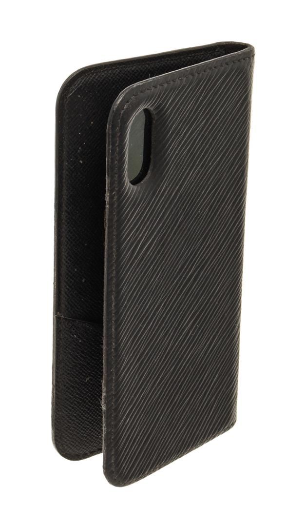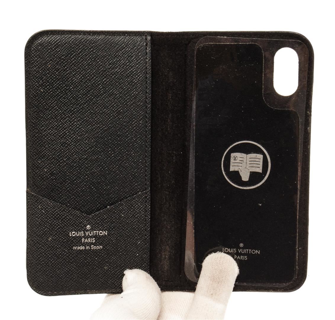 One Louis Vuitton Black Epi Leather iPhone X Folio Case. Item is sold AS-IS. All available information is listed in the description and shown in the photo. Louis Vuitton Black Epi Leather iPhone X Folio Case features black leather lining, black interior card holder and single slip pocket with flap-closure.