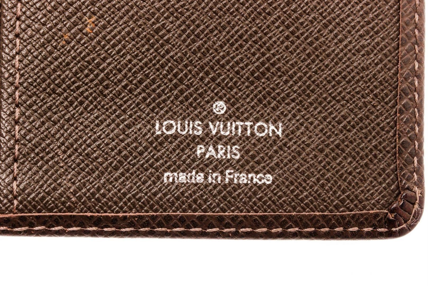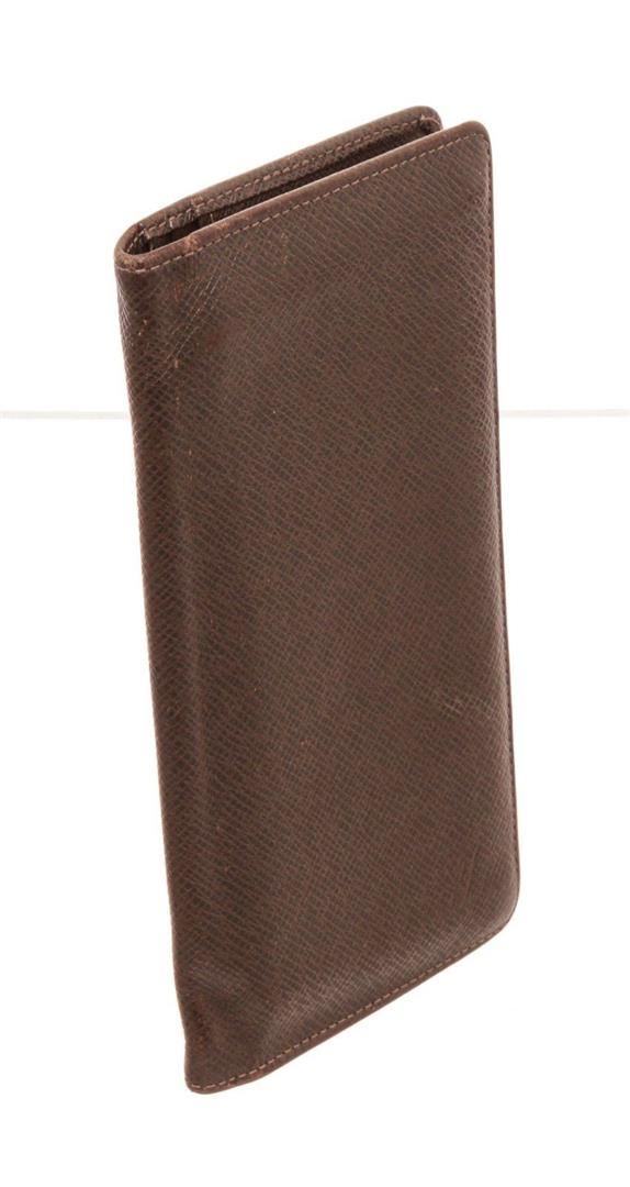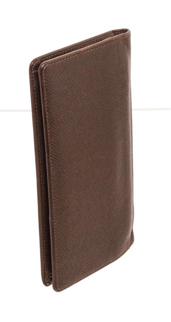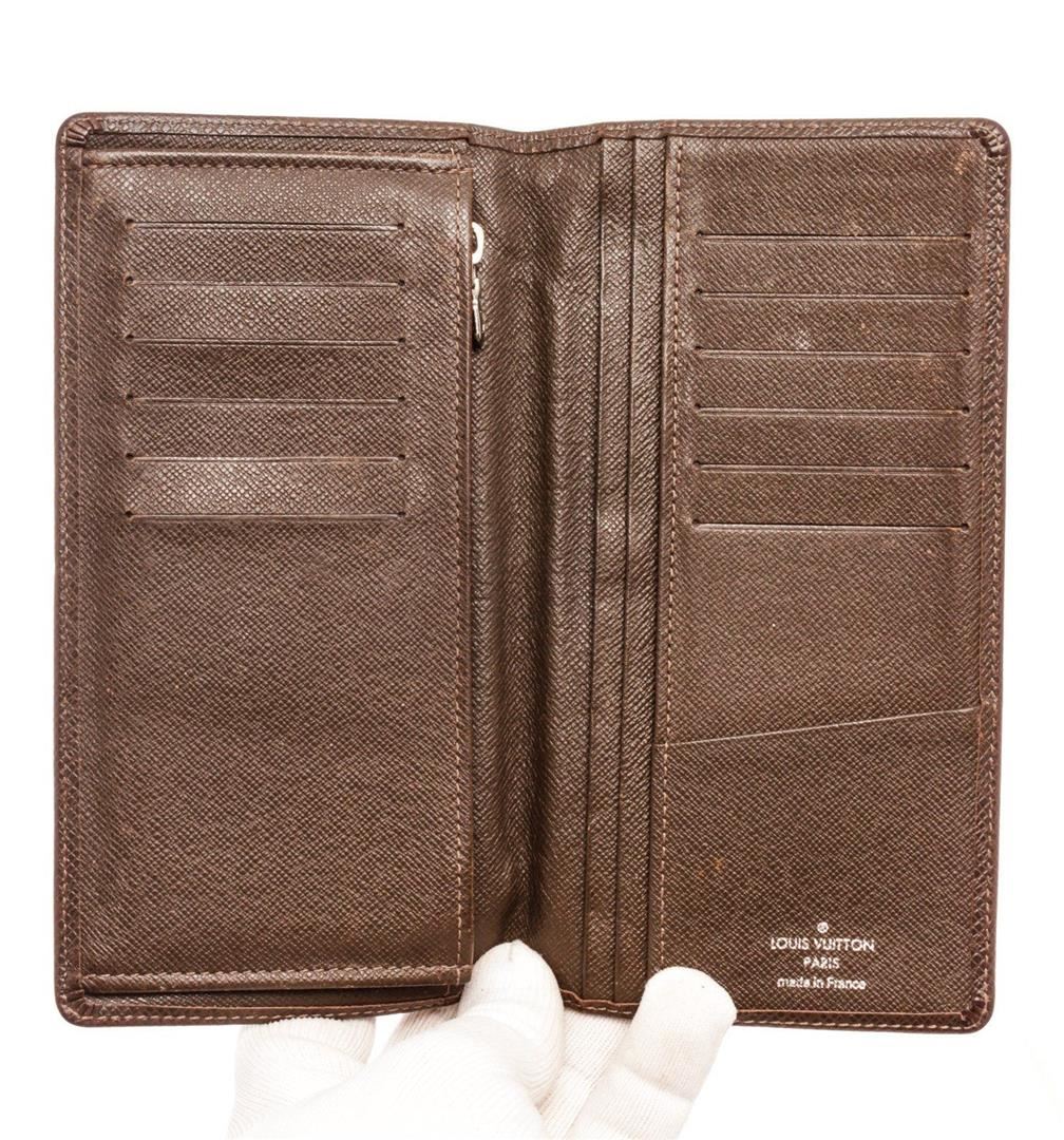Louis Vuitton Black Leather Brazza Wallet with material leather, gold-tone hardware, trim tan vachetta leather, interior card holder pocket, leatherlining and flap closure.