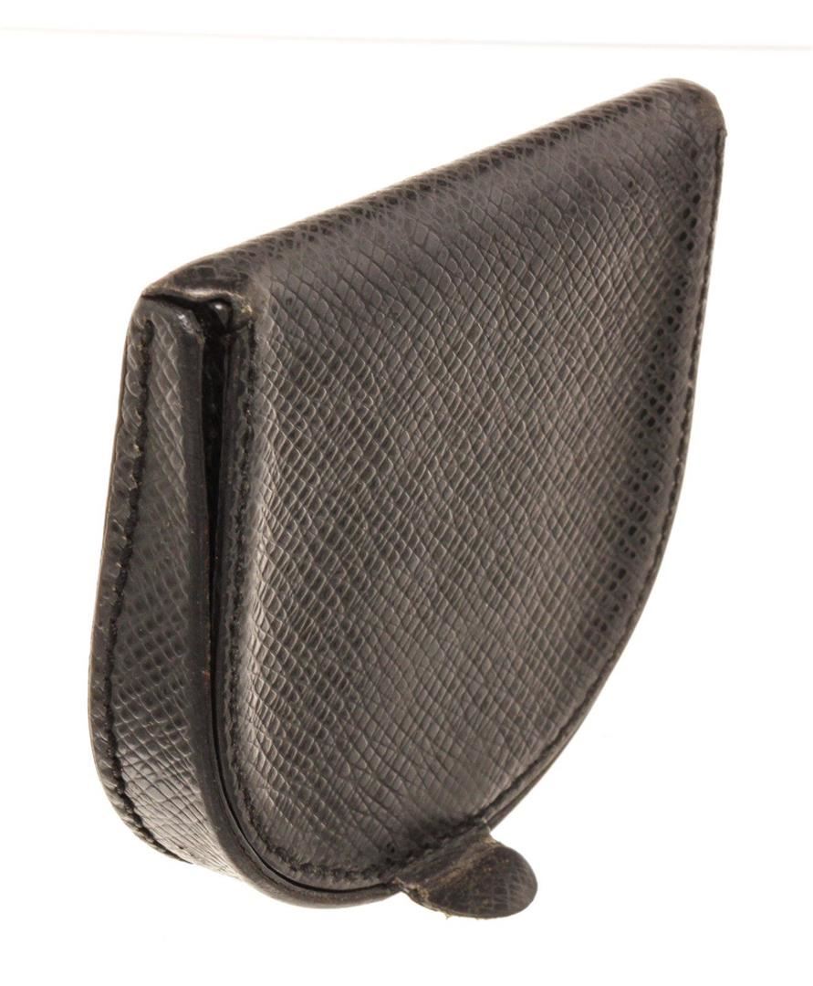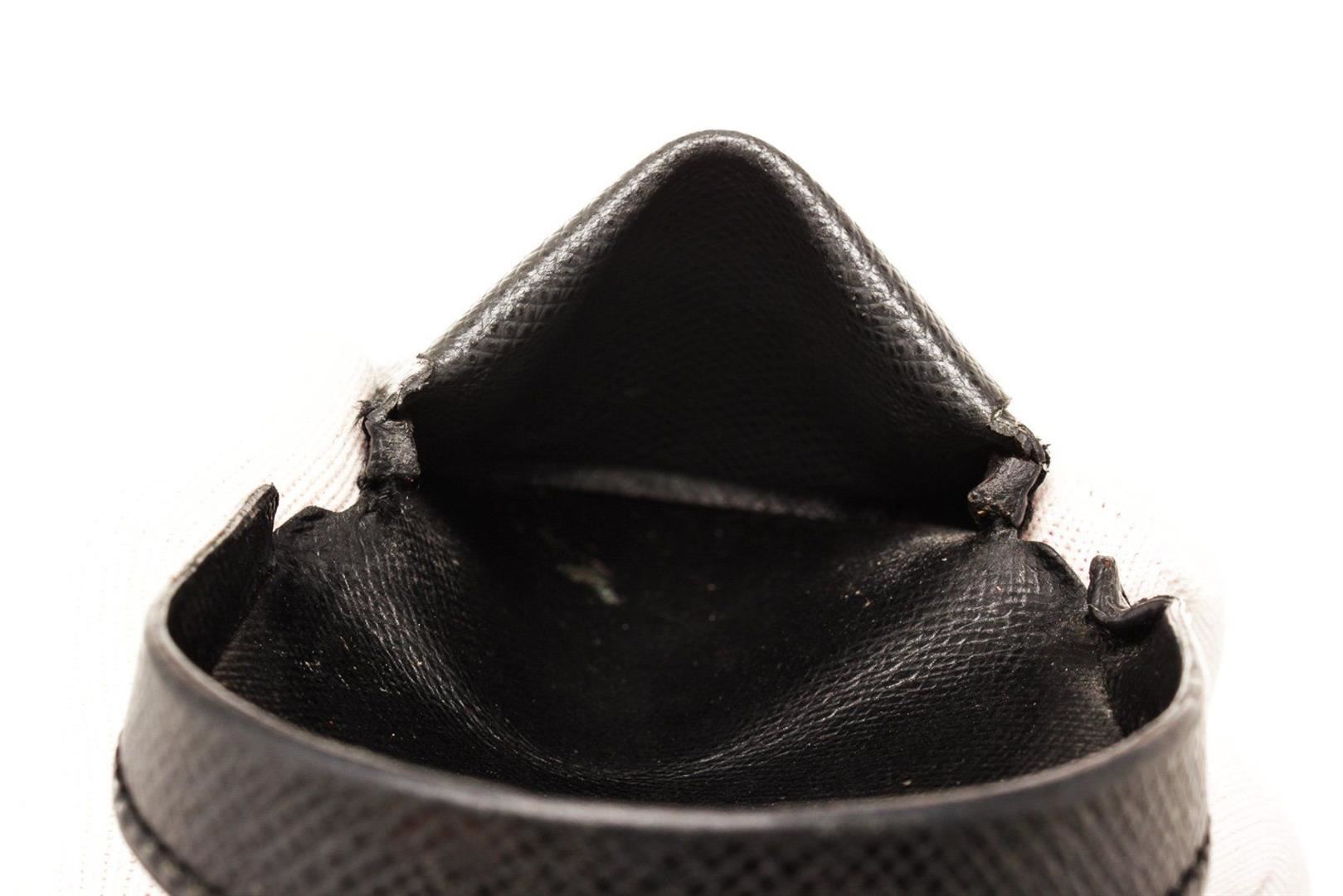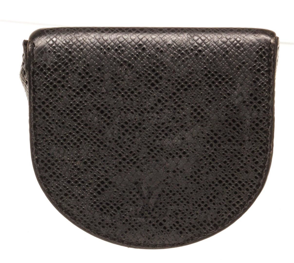 Louis Vuitton Black Leather Coin Purse Wallet with monogram canvas, gold-tone hardware, trim tan vachetta leather, interior slip pocket and snap closure.