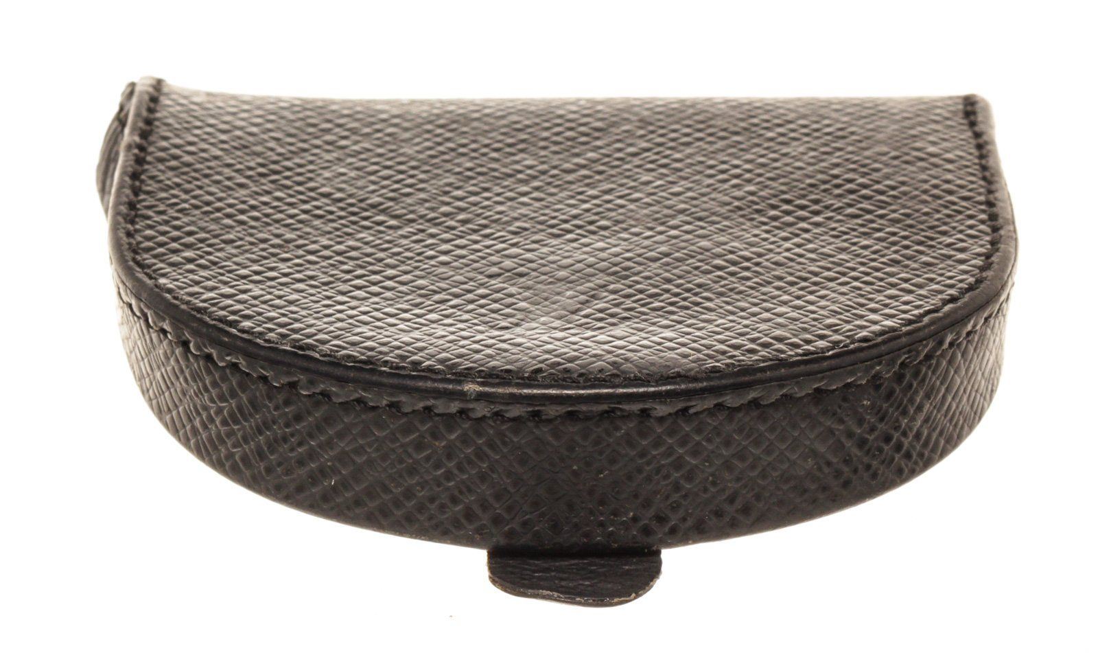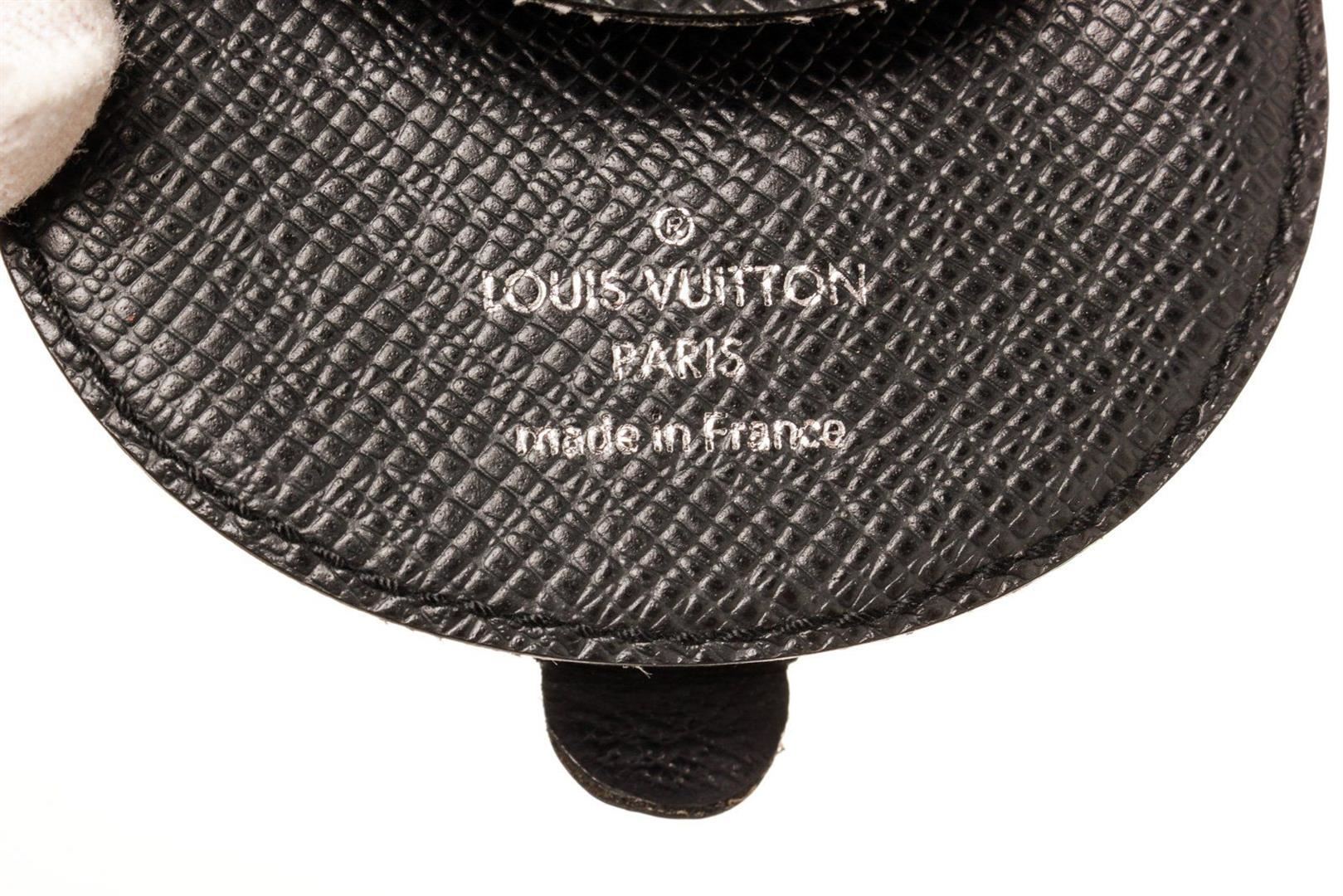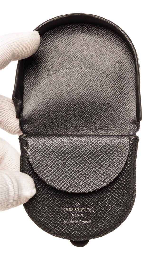 Louis Vuitton Black Leather Coin Purse Wallet with monogram canvas, gold-tone hardware, trim tan vachetta leather, interior slip pocket and snap closure.