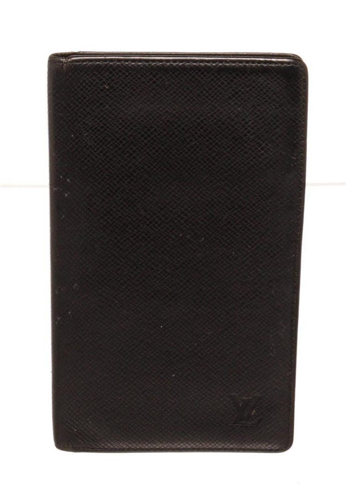 Louis Vuitton Black Leather European Checkbook Wallet with material leather, gold-tone hardware, trim tan vachetta leather, interior cardholder pockets and flap closure.