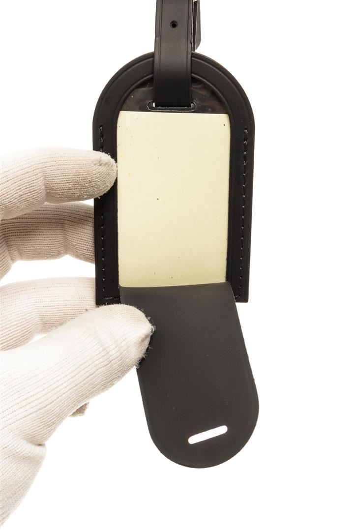 Louis Vuitton Black Leather Fragment Luggage Tag. Please see photos and description for all available information! Louis Vuitton Black Leather Fragment Luggage Tag Height 2", Width 3.5", Depth " / 5.08 x 8.89 Cm, Strap Drop None