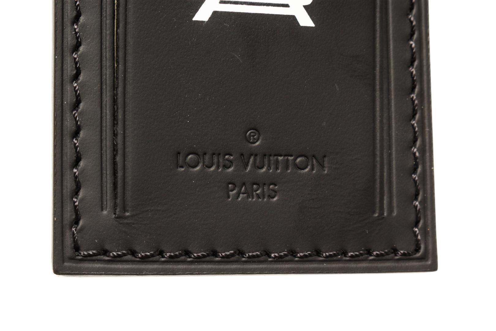 One Louis Vuitton Black Leather Fragment Luggage Tag. Item is sold AS-IS. All available information is listed in the description and shown in the photo. Louis Vuitton Black Leather Fragment Luggage Tag Height 2", Width 3.5", Depth " / 5.08 x 8.89 Cm, Strap Drop None