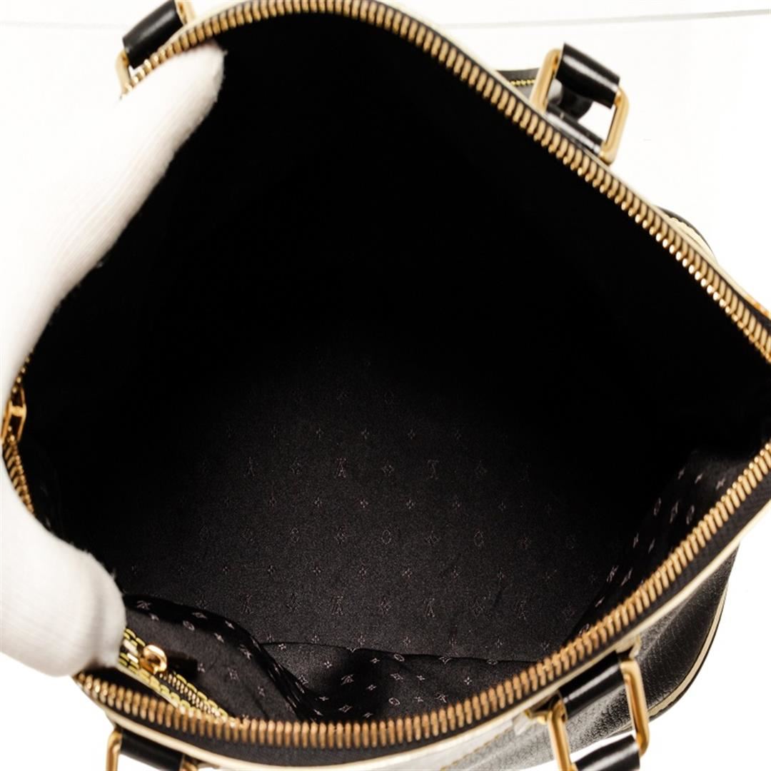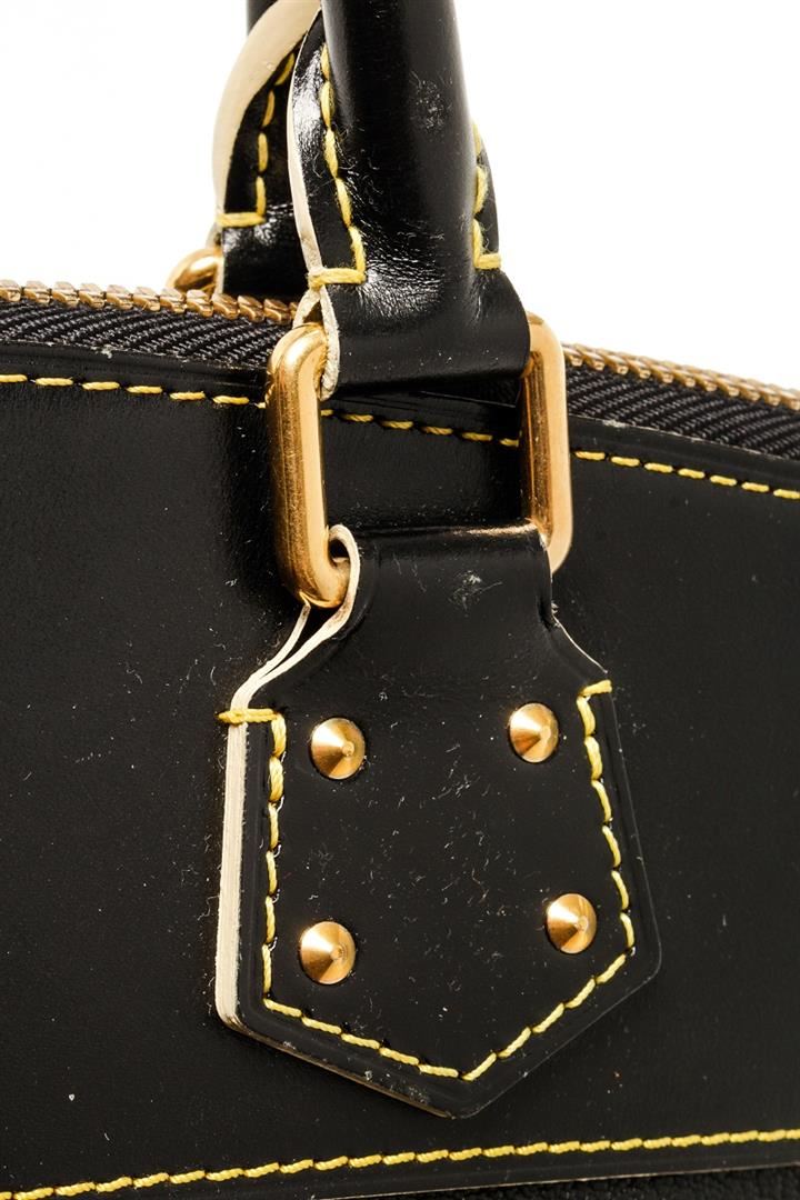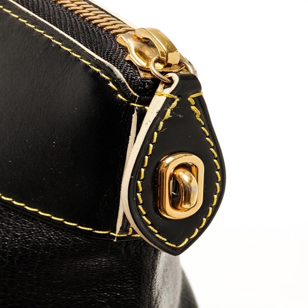 One Louis Vuitton Black Leather Lockit PM Tote Bag. Item is sold AS-IS. All available information is listed in the description and shown in the photo. Louis Vuitton black leather Lockit PM tote bag with leather exterior, black fabric lining, contrasting yellow stitching, gold-tone hardware, interior slip pocket, dual top handle, and zipper closure.