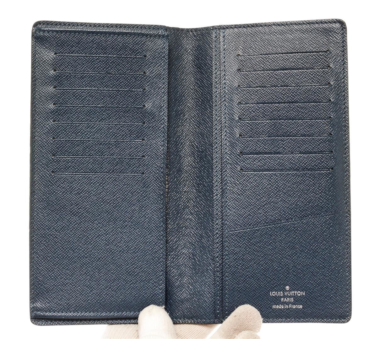 One Louis Vuitton Black Leather Portefeiulle Ron Bifold Wallet. Item is sold AS-IS. All available information is listed in the description and shown in the photo. Louis Vuitton black leather Portefeiulle Ron bifold wallet with black leather exterior, an LV logo embossed on the bottom right corner, blue leather inside, several compartments, and multiple card slots. There are markings and scratches on the exterior leather. Please refer to photos. 3.54"L x 7.48"W x 0.78"H / 8.99 x 18.9 x 1.98 cm